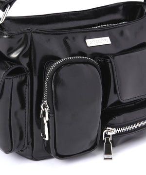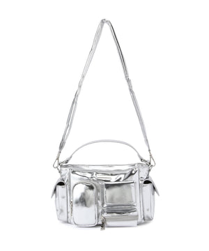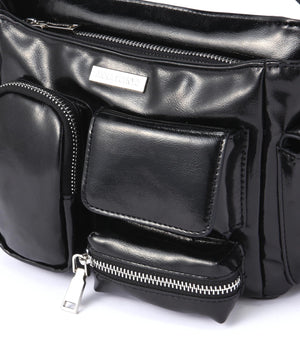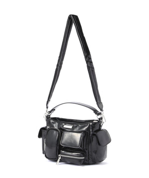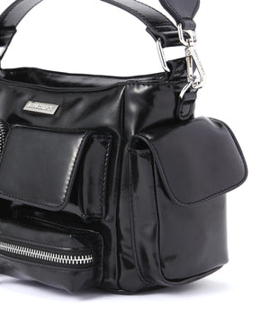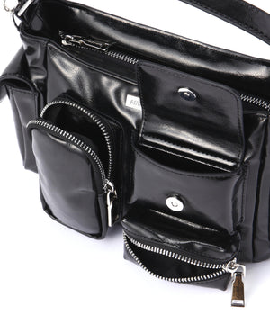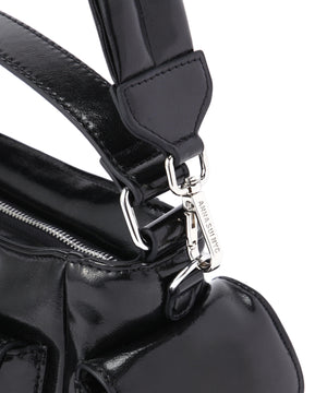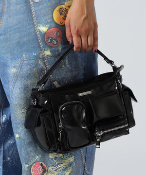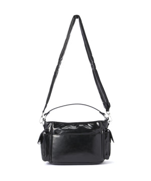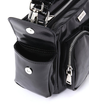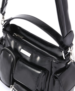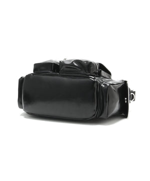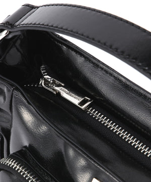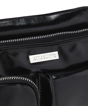 コンパクトなサイズ感ながら、異なるサイズのポケットが複数ついた機能的なチビバッグ。フロントのポケットにはリップやワイヤレスイヤホン、バックのポケットはスマートフォンなど、入れたいものが“ちょうどよく”収まるから、使い勝手も抜群。内側にも3つのポケットが付いているので、バックの中身を綺麗に仕分けることができます。ほどよく入った中綿のふっくらとしたフォルムと、光沢感のある素材づかいが存在感を放ちます。付属のベルトを付ければ、ショルダーとしても使える2WAY仕様です。
