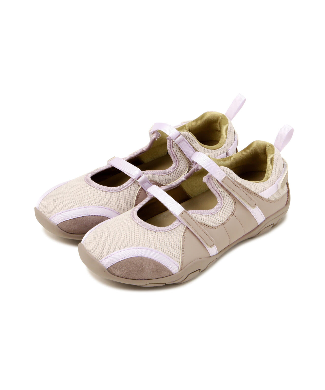 光沢感のあるウェビングツーストラップと通気性のよいメッシュ素材で快適な履き心地とバレエコアムードのロマンチックな感性を見せるカラー感でカジュアルだけでなく、特別な場でも完璧なスタイリングを完成します。