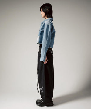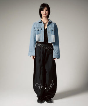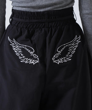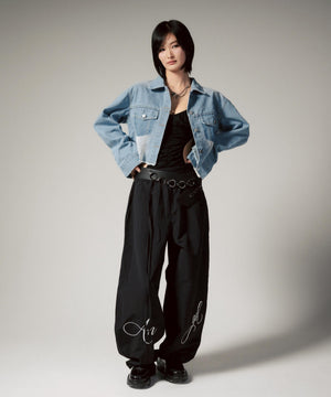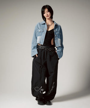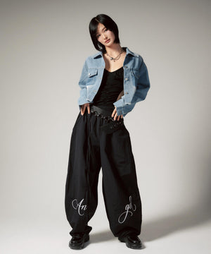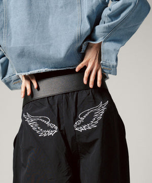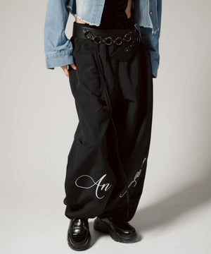 黒ナイロンのクールさと刺繍の存在感が絶妙にマッチし、ストリートにもY2Kにもハマる1本です。
