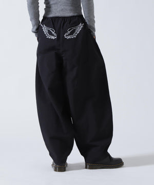 軽くてさらっと穿けるナイロン素材のワイドパンツ。