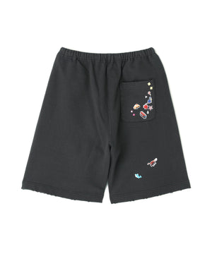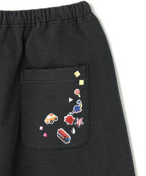 幼い子供がいたずらにシールを貼ったイメージでデザインされたスウェットショーツ。