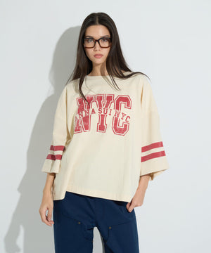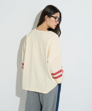 フットボールTシャツをベースにした切り替えデザインになっており、袖部分に肌触りの良いワッフル生地を採用することで、スポーティな雰囲気と他のアイテムと差を付けるデザイン性をプラス。
