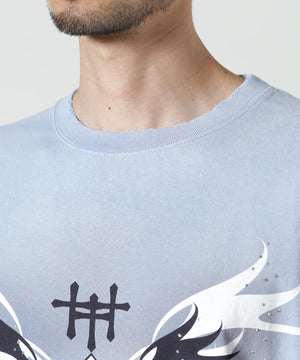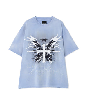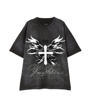 フロントにはクロスと羽、young fr13ndsのロゴが施されており、Y2Kの雰囲気を彷彿とさせるデザインです。