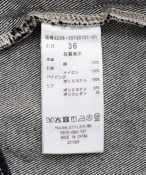 デニムの後ろ身頃を上下逆さに配置した大胆な構築デザインで、衿が裾側についた独自のバランスが魅力です。