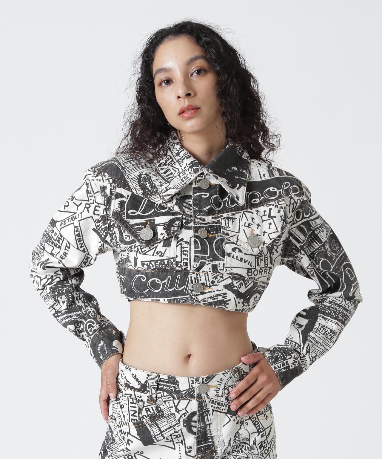 VAQUERAの「PARIS SYNDROME」シリーズを象徴する、総柄デザインを全面に落とし込んだクロップドデニムジャケット。