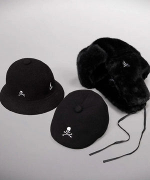 KANGOLで定番の「FAUX FUR TRAPPER」をベースに、後ろ部分にはカンガルーロゴ刺繍、耳当て部分の左右と表裏すべてにmastermind JAPANの代名詞スカル刺繍が施されています。