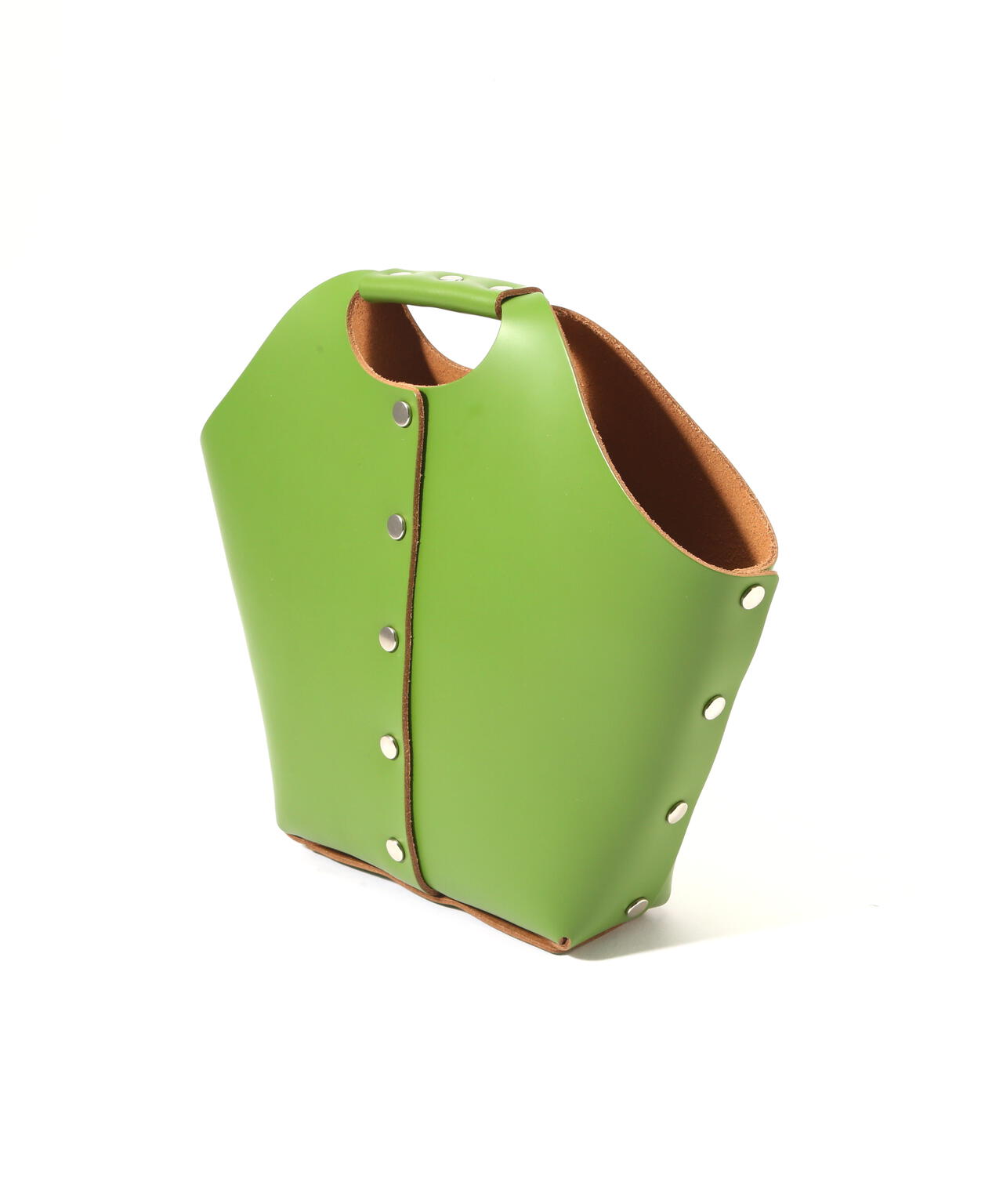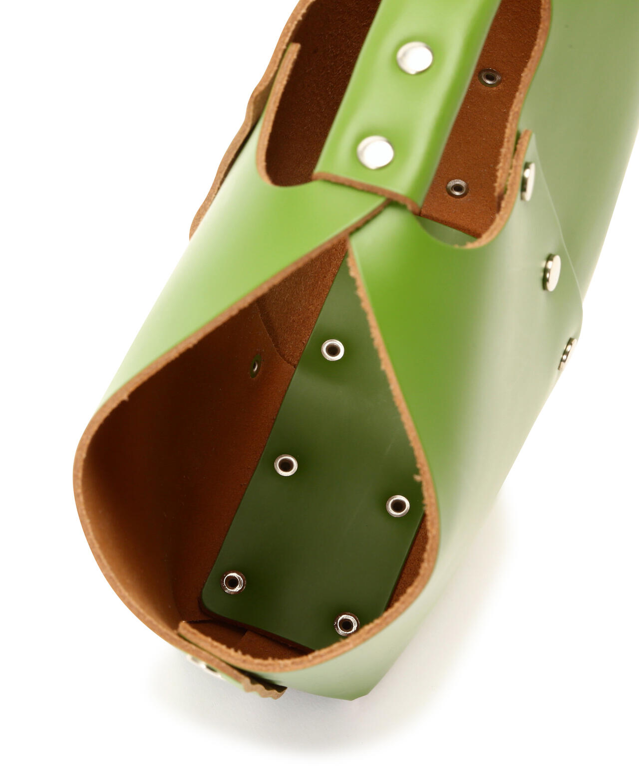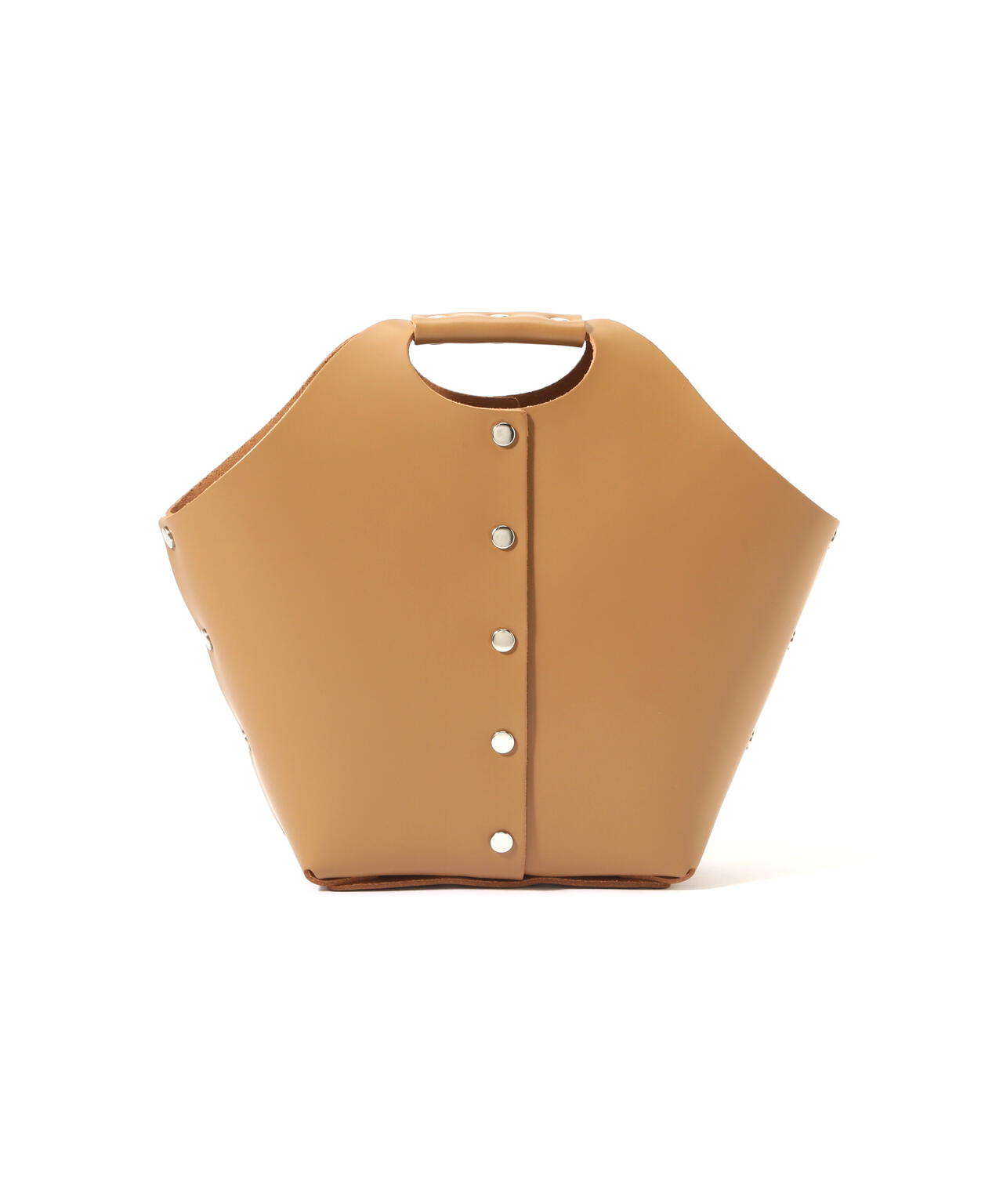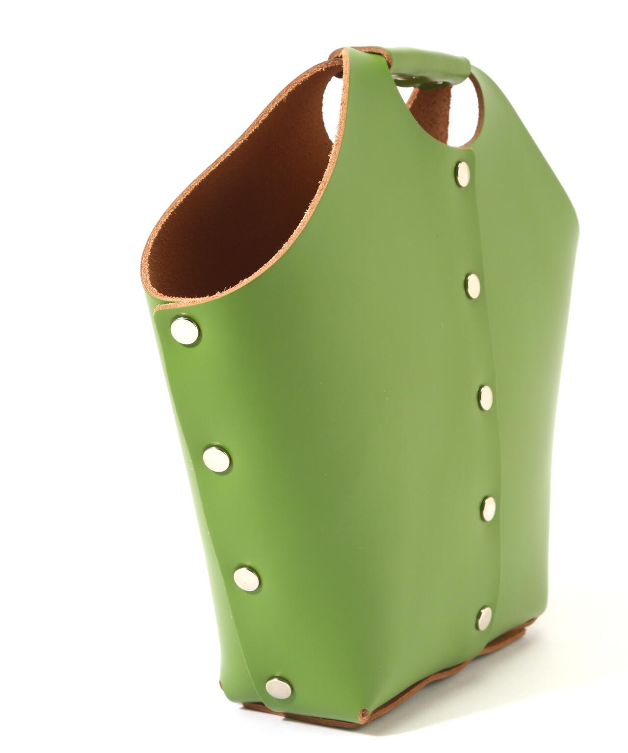 プラモデルを組み立てるように縫製などのプロセスを介さず、レザーのパーツをリベットで留め、組み立てることで成形したプロダクト。
