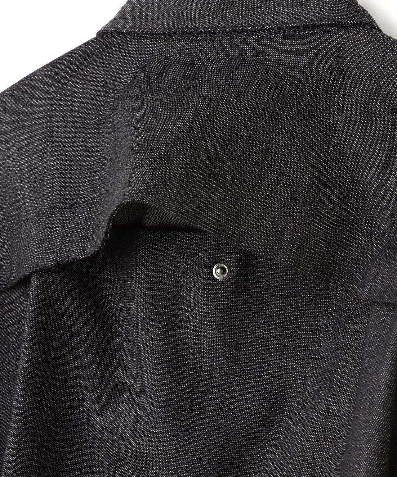 背面にスナップボタンで、ベンチレーションを入れベンチレーション本来の通風や換気、風通しを良くする役割も果たしつつシルエットに変化を与えてくれるディテールにもなっております。