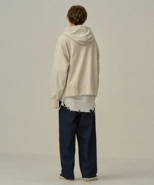 古着のスウェットフーディの首元を裂き、Vゾーンを作って着ていたものが着想源。