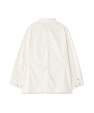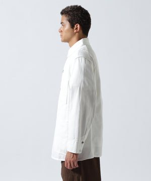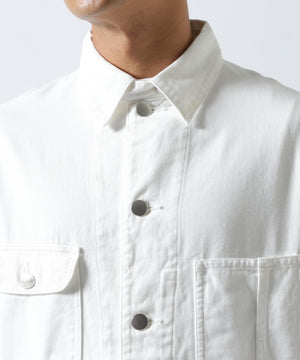 そこに作業着としてのディテールも加わり、唯一無二の存在感を放ちます。こうしたアイテムはヴィンテージに忠実につくりたくなるところですが、〈FOUNDOUR〉では胸ポケットのみ、チェンジボタンに仕様をアレンジ。