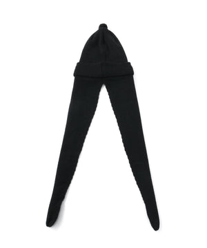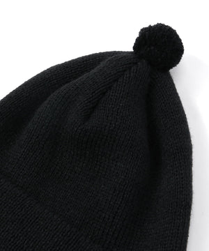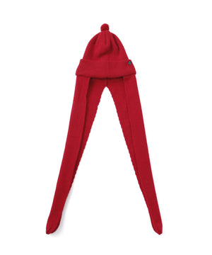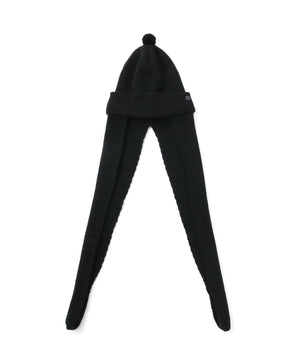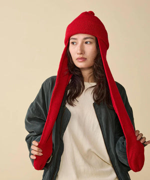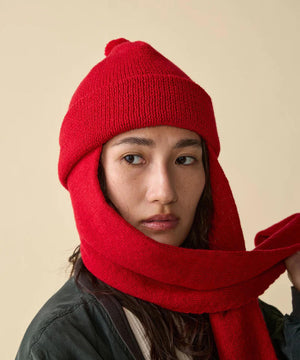 天井部分は縫い代がごろつかないよう六方カットで縫製し、快適なかぶり心地を実現。また全体のバランスを整えるため、天頂には直径約45mmの小さな梵天(ポンポン)を取り付けました。そして最大の特徴は、長さ約60cmのロングイヤーフラップ。そのまま垂らしても、マフラーのように首に巻いてもOK。イヤーフラップはフェイスラインをやさしく包み込む位置に取り付けてありますので、被ったときにはフードをかぶっているような安心感が得られます。重ね着が増える秋冬シーズンに活躍する、実用性と個性を兼ね備えたワンポイントアイテムです。