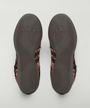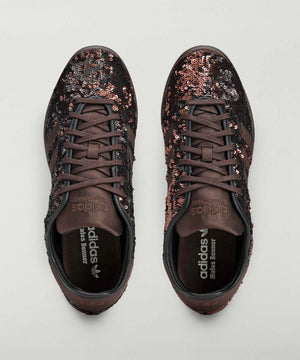 このモデルは、アディダスのレガシーに刻まれたさまざまな瞬間と要素を採り入れながら、ベースとなるシルエットを再構築したもの。新たなアウトソールには、流れるようなデザインを採用。アッパーにはきらめくスパンコールを、サイドにはサテンのスリーストライプスをあしらっている。