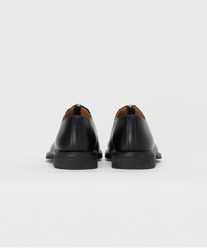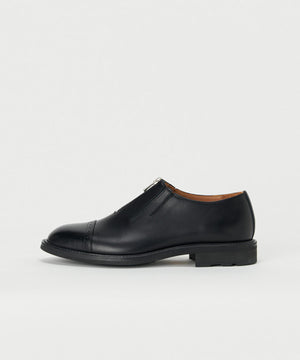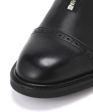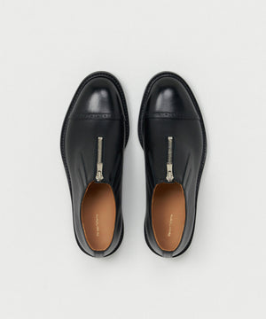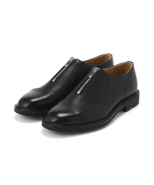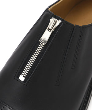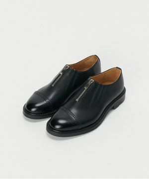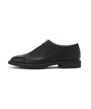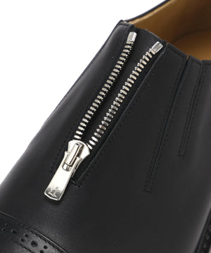 クラシカルなパンチドキャップトゥのデザインに、シューレースではなく大胆にジップを施した一足。