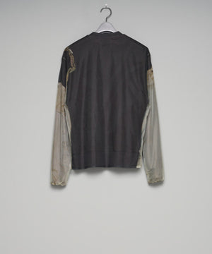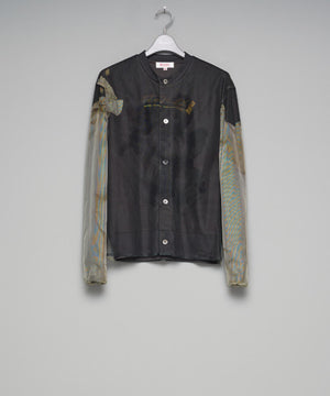 チュール面に1900年代のフロックコートを裏返し、時代を経たコートの質感や、当時のタグをプリント。