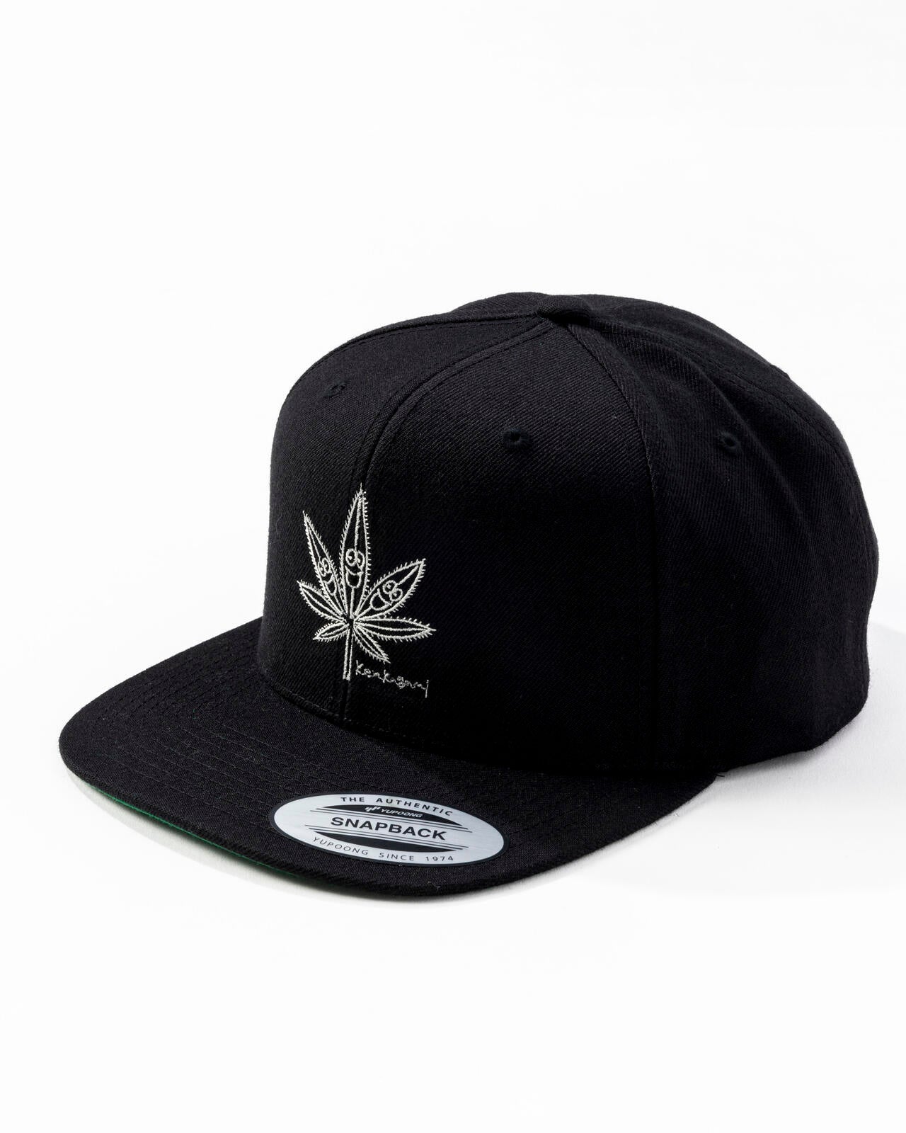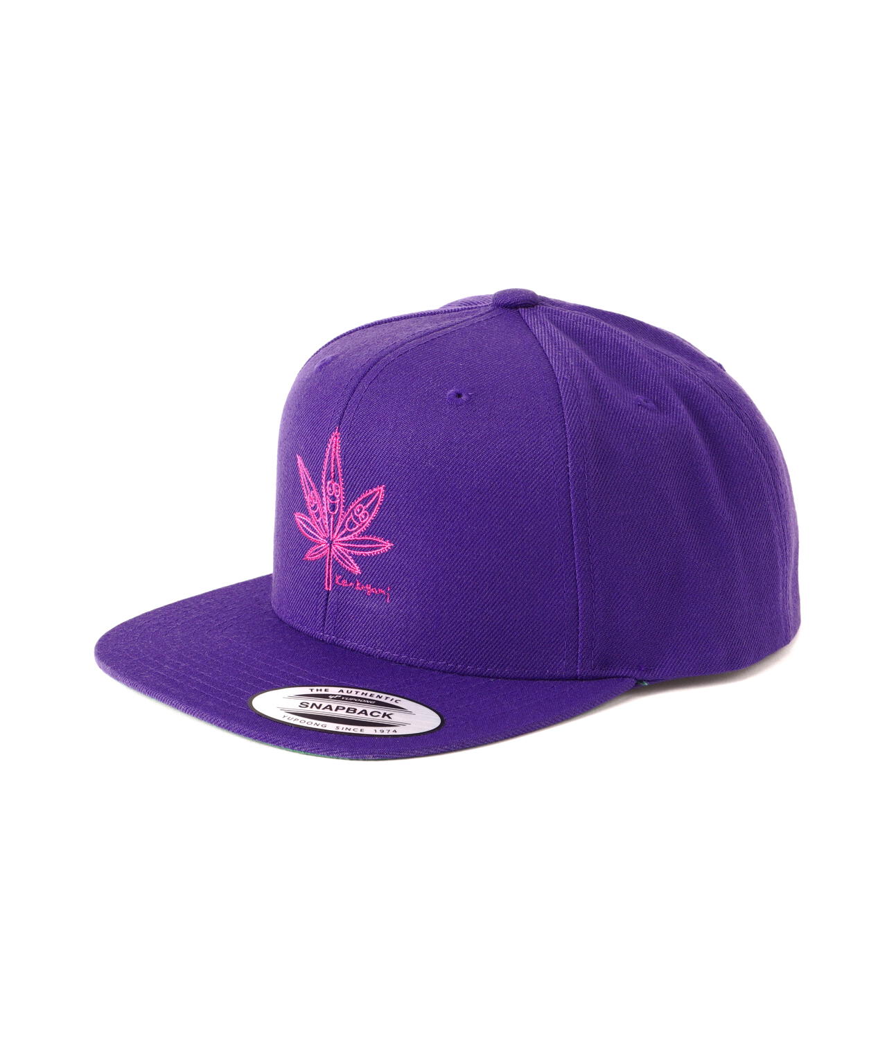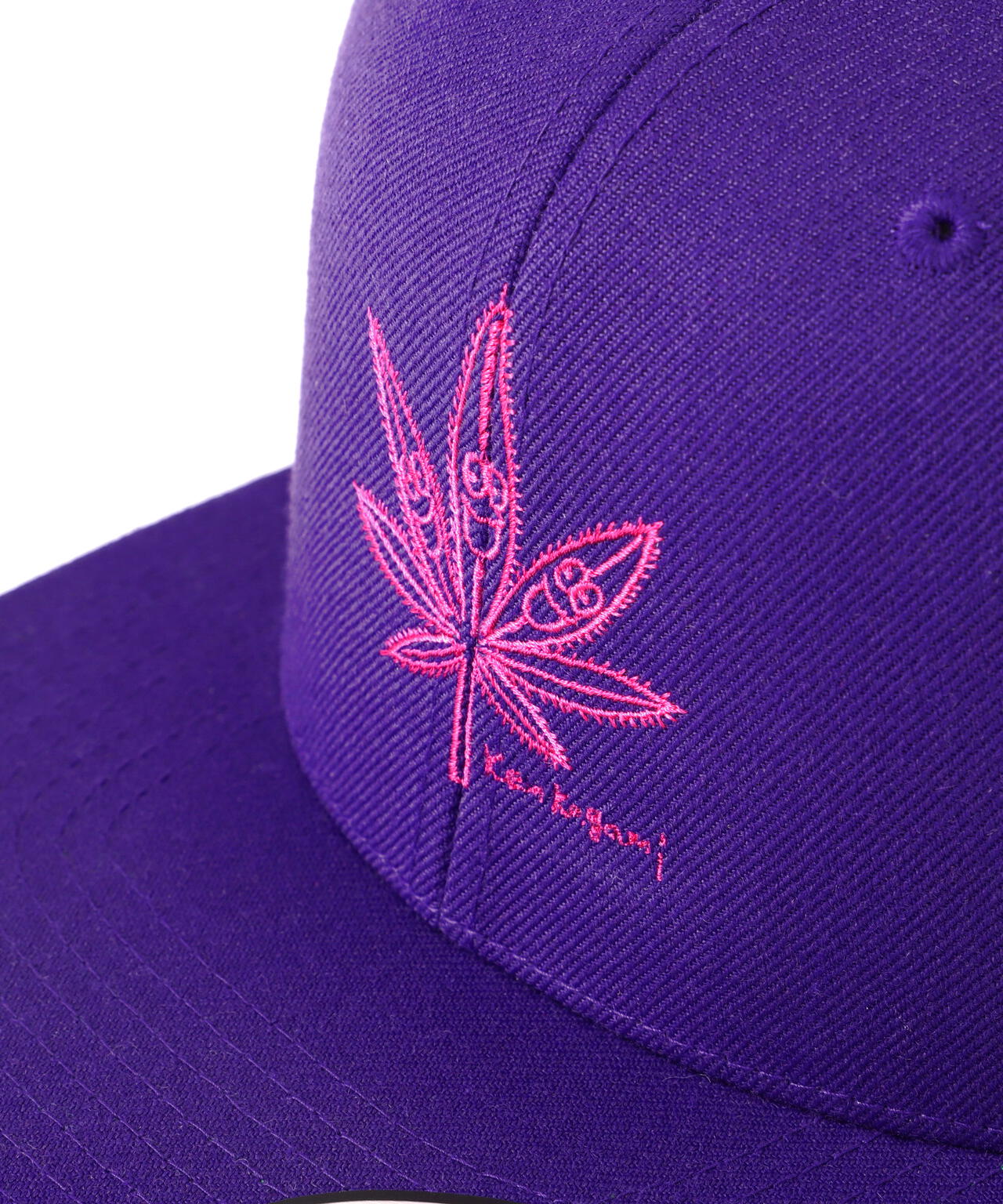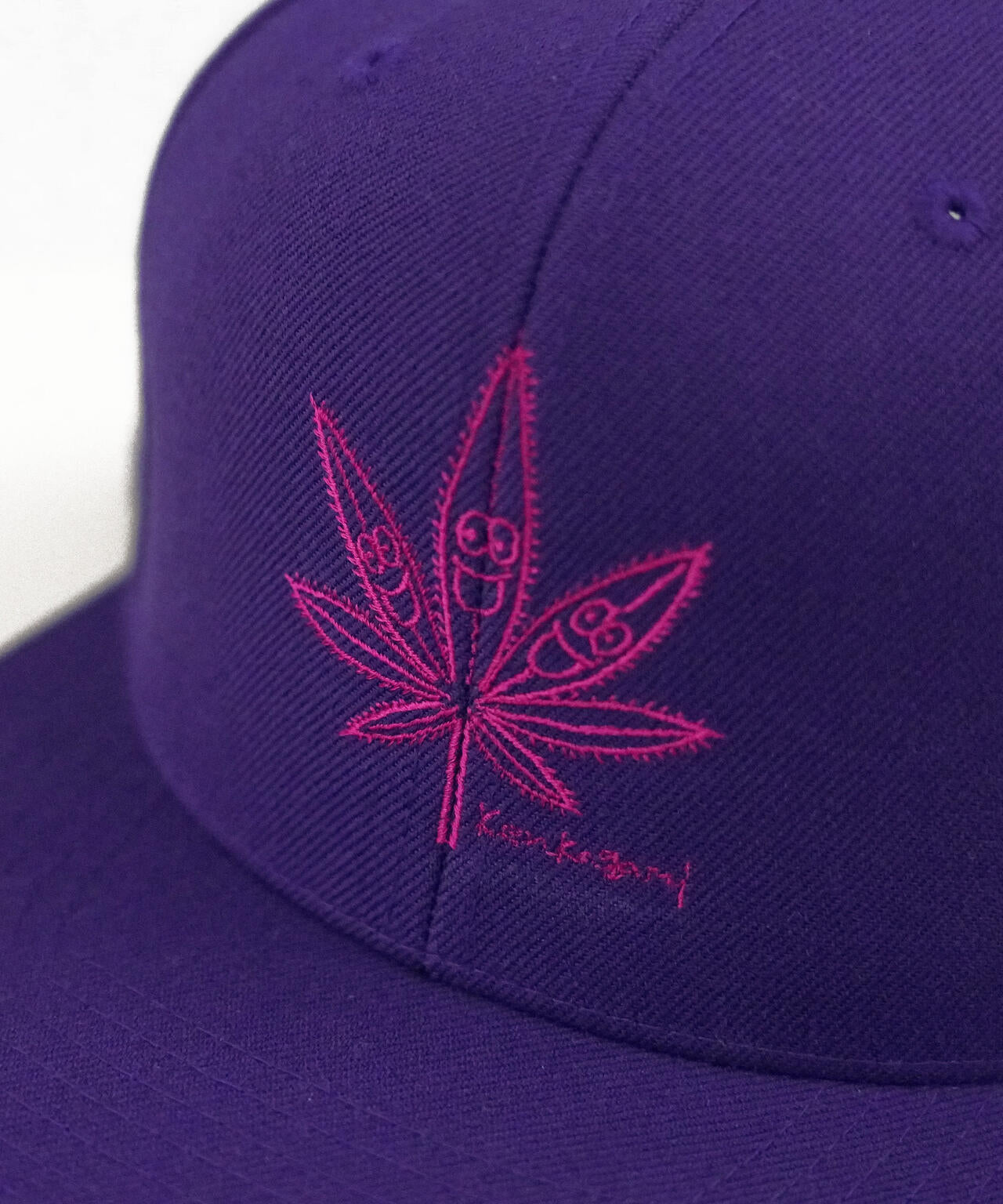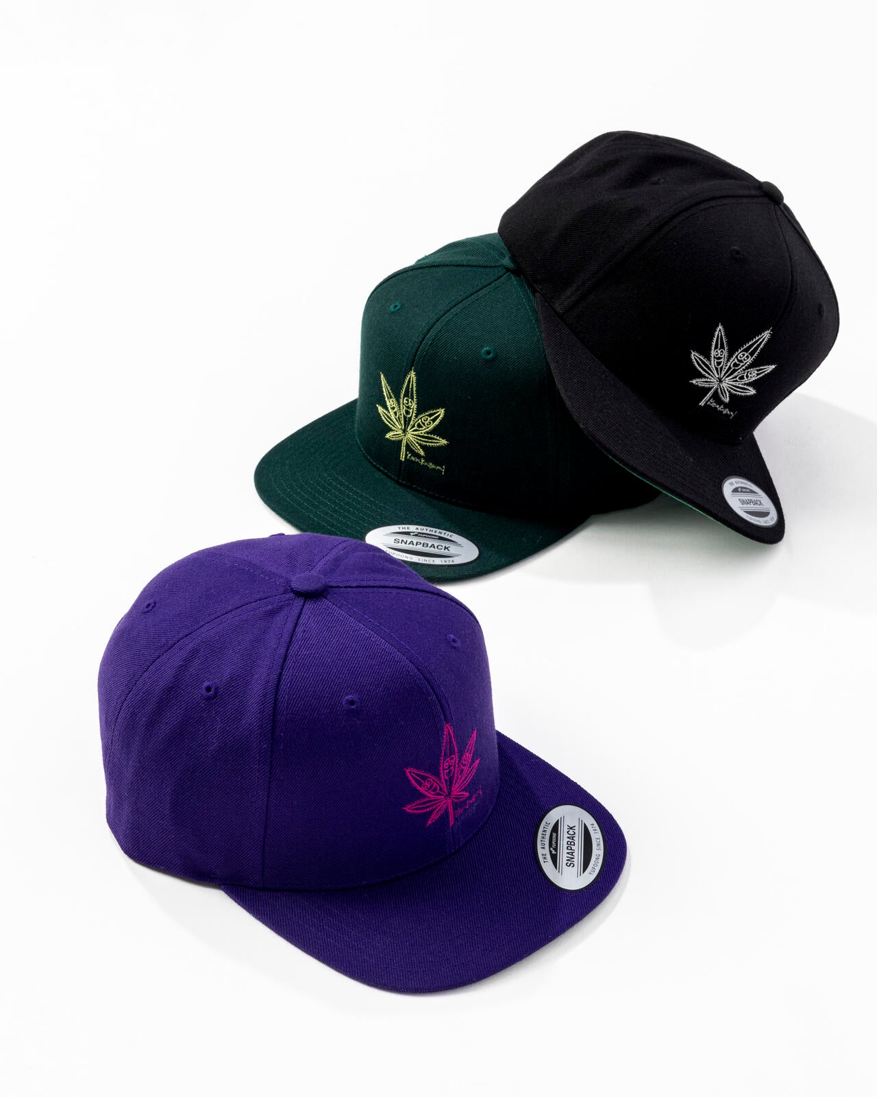 フラットバイザースナップバックに、手描きのイラストを刺繍で表現。