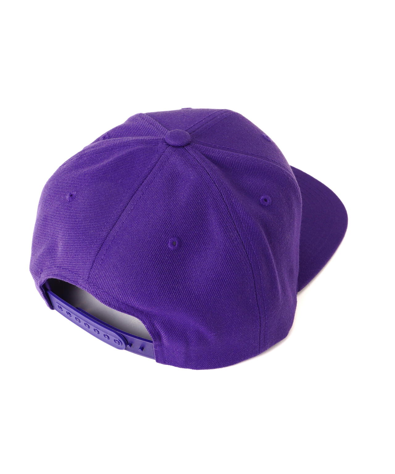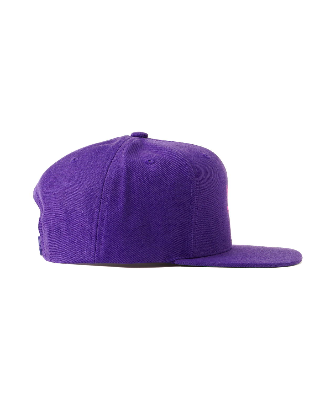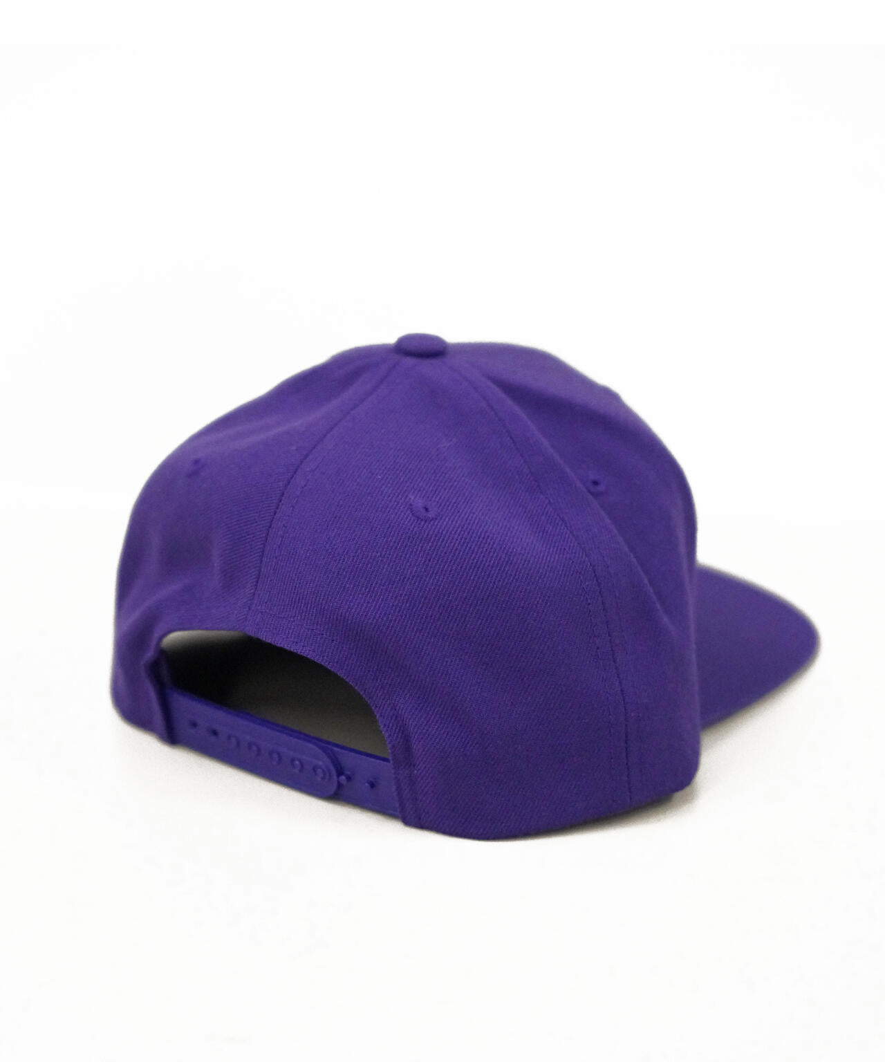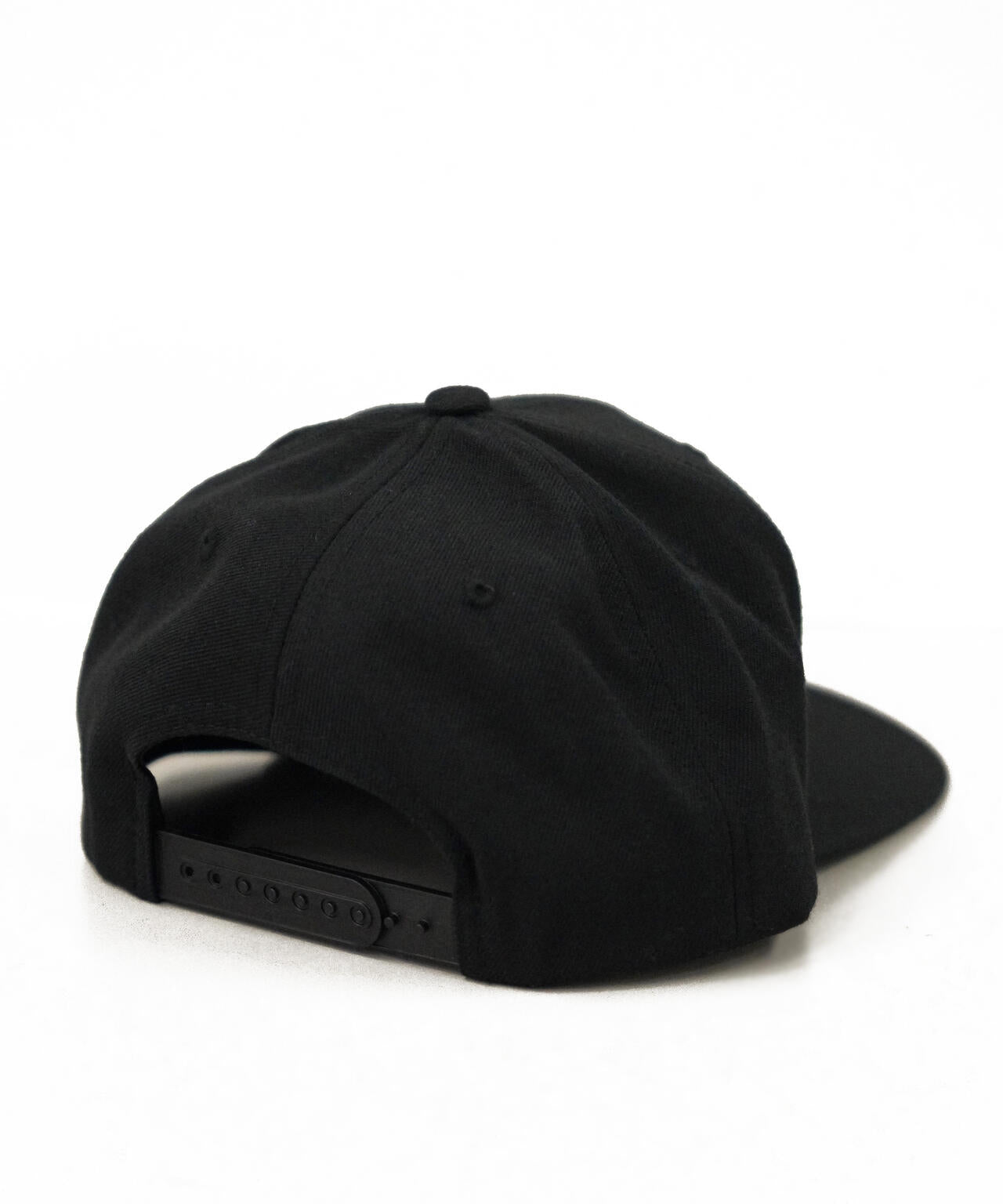 フラットバイザースナップバックに、手描きのイラストを刺繍で表現。