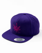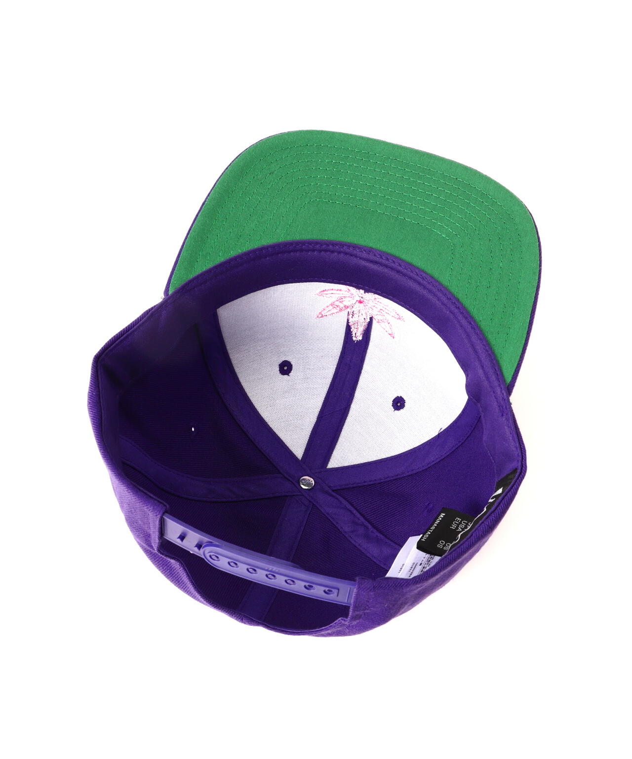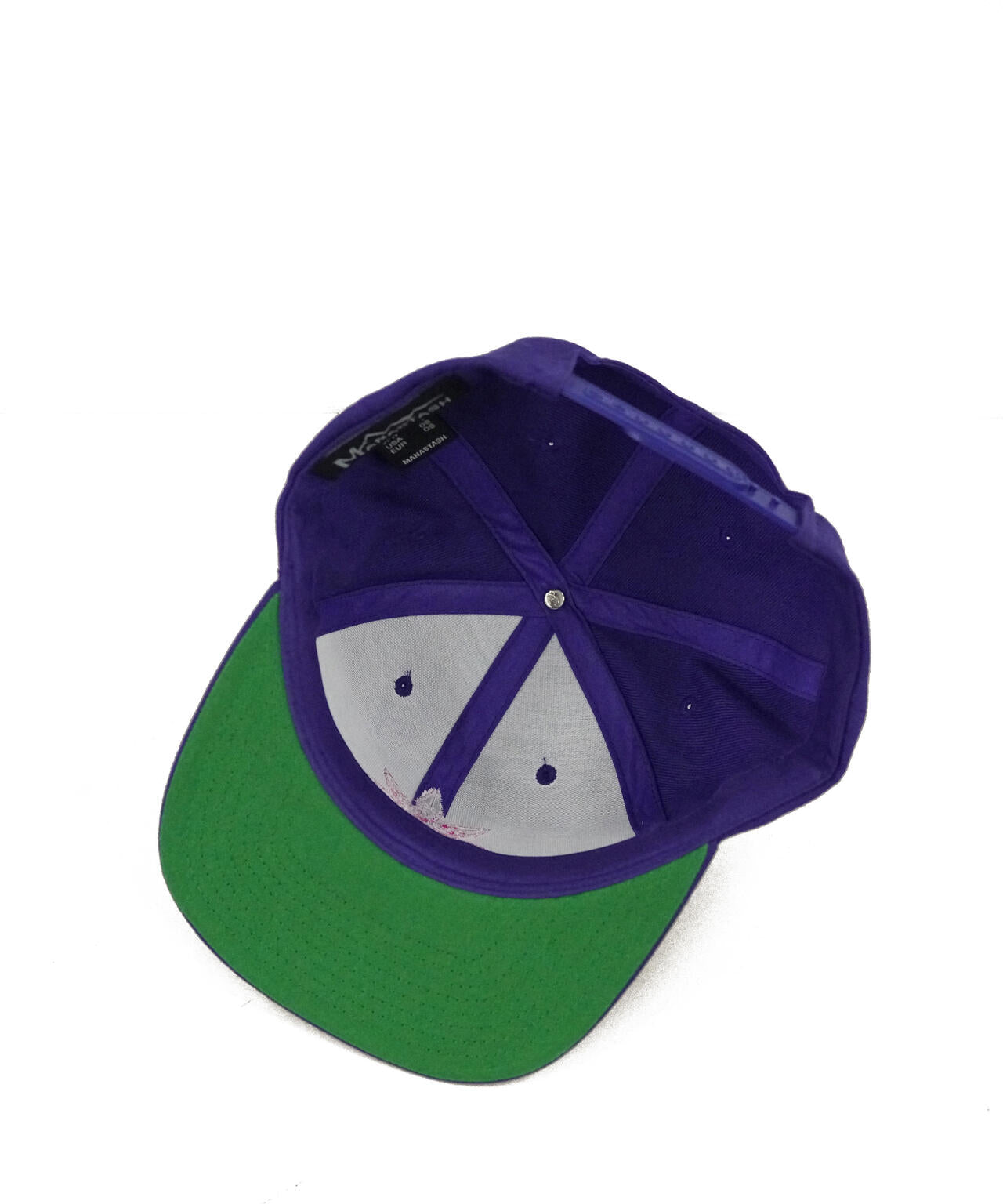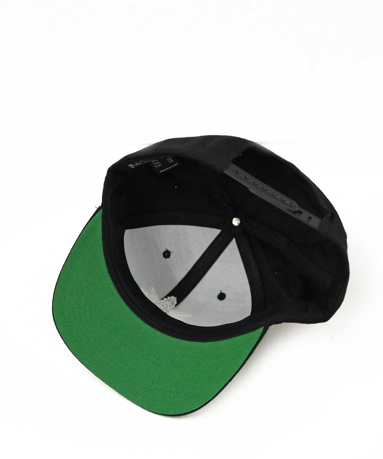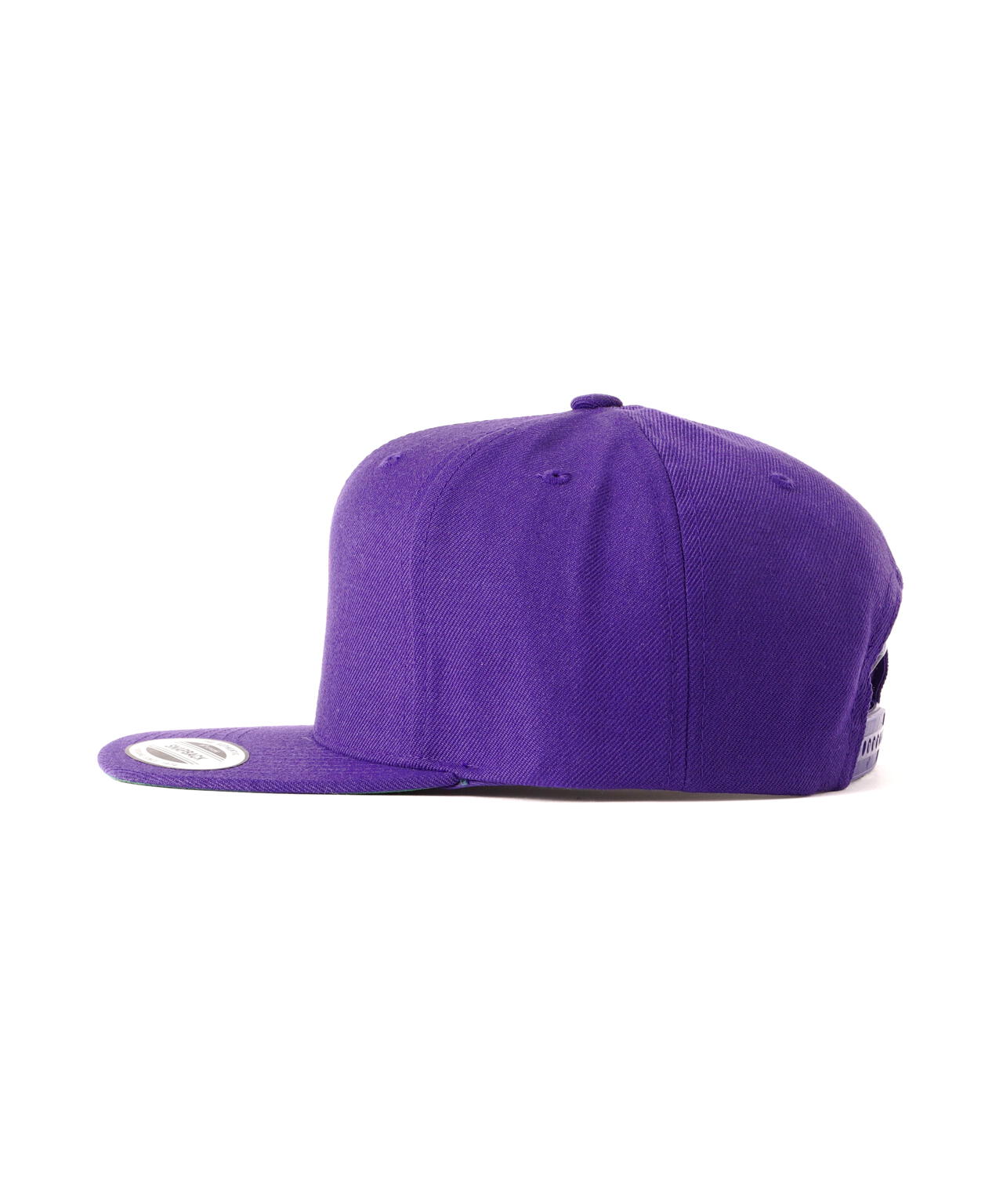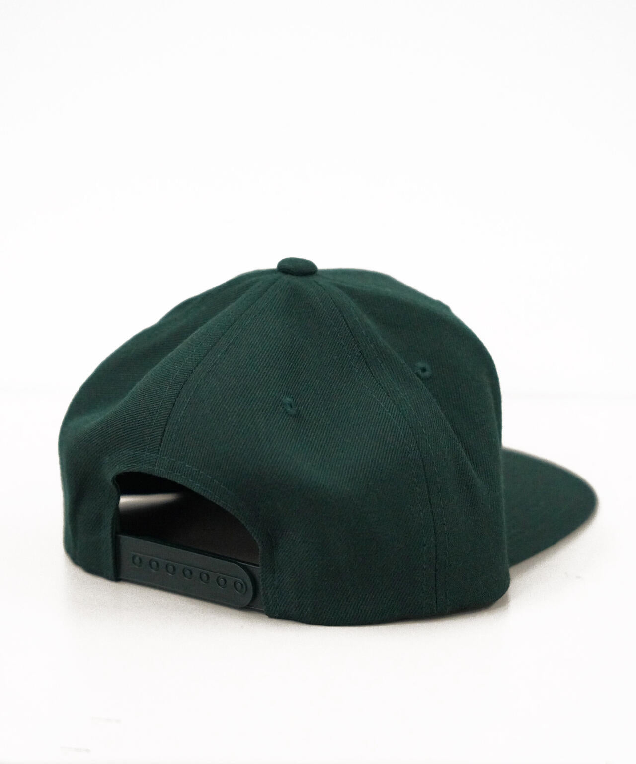 フラットバイザースナップバックに、手描きのイラストを刺繍で表現。