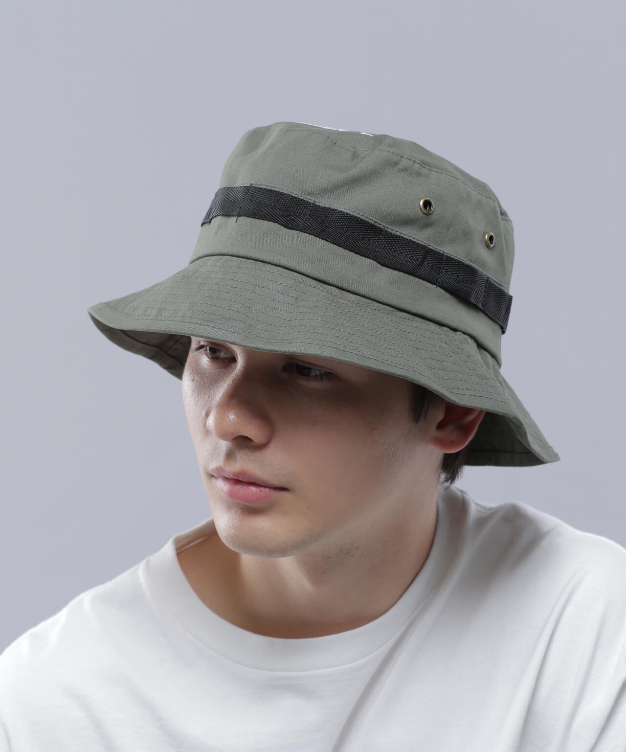 山をイメージしたロゴを配置したシンプルなバケットハット。