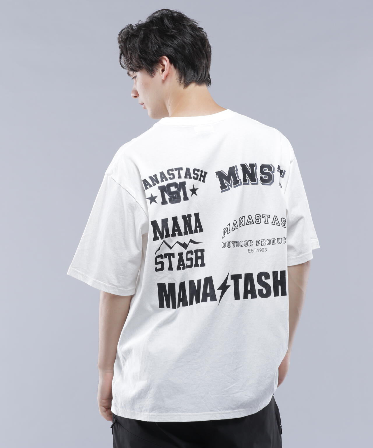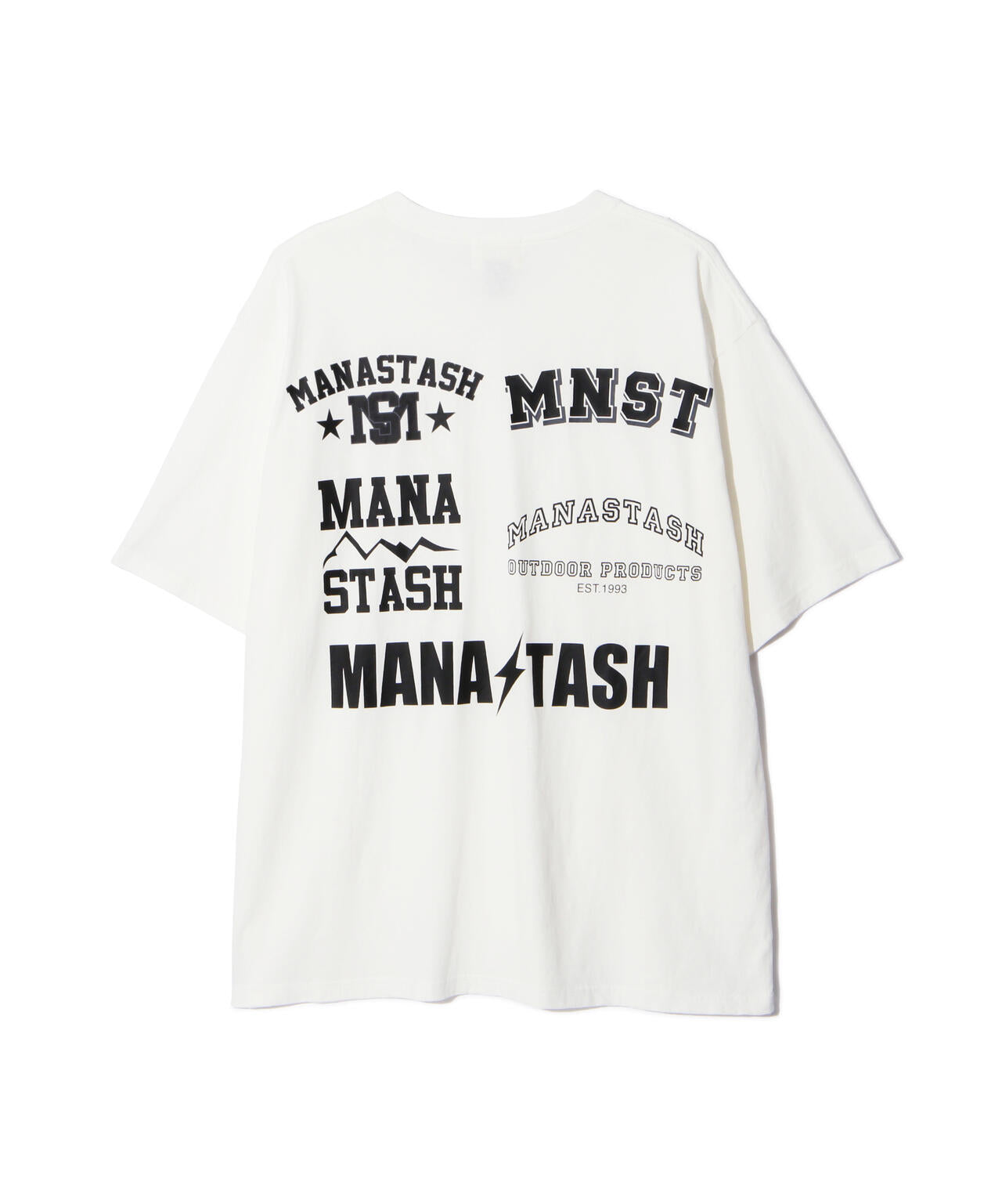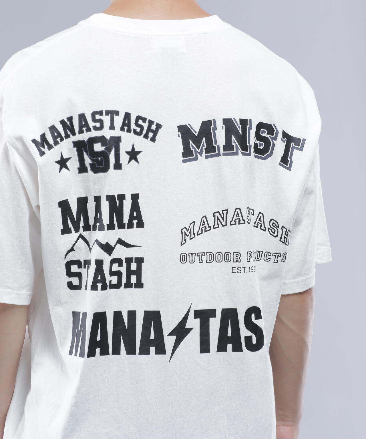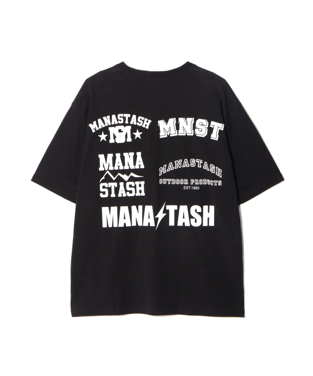 ・フロントには左胸にMANASTASHロゴがシンプルに入り、背中はスポーツの大会等で見られるスポンサーロゴが入った仕様で、様々なMANASTASHロゴが配置されている