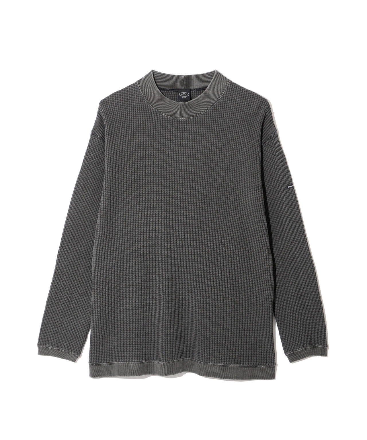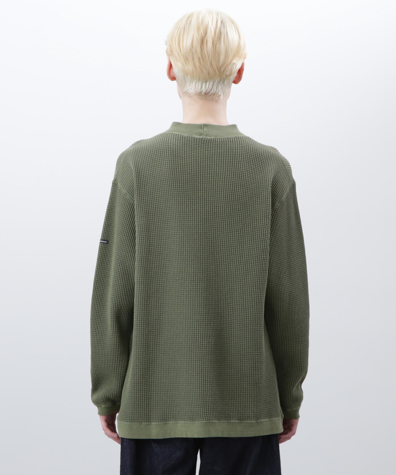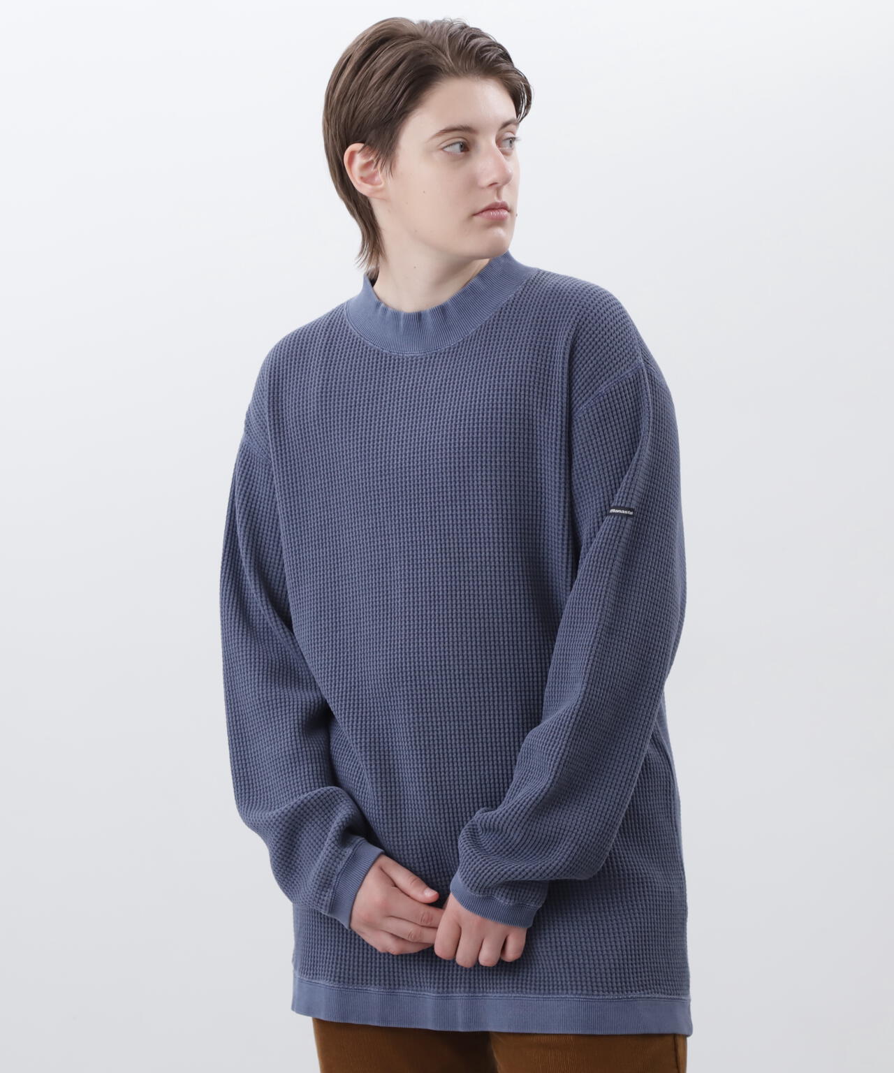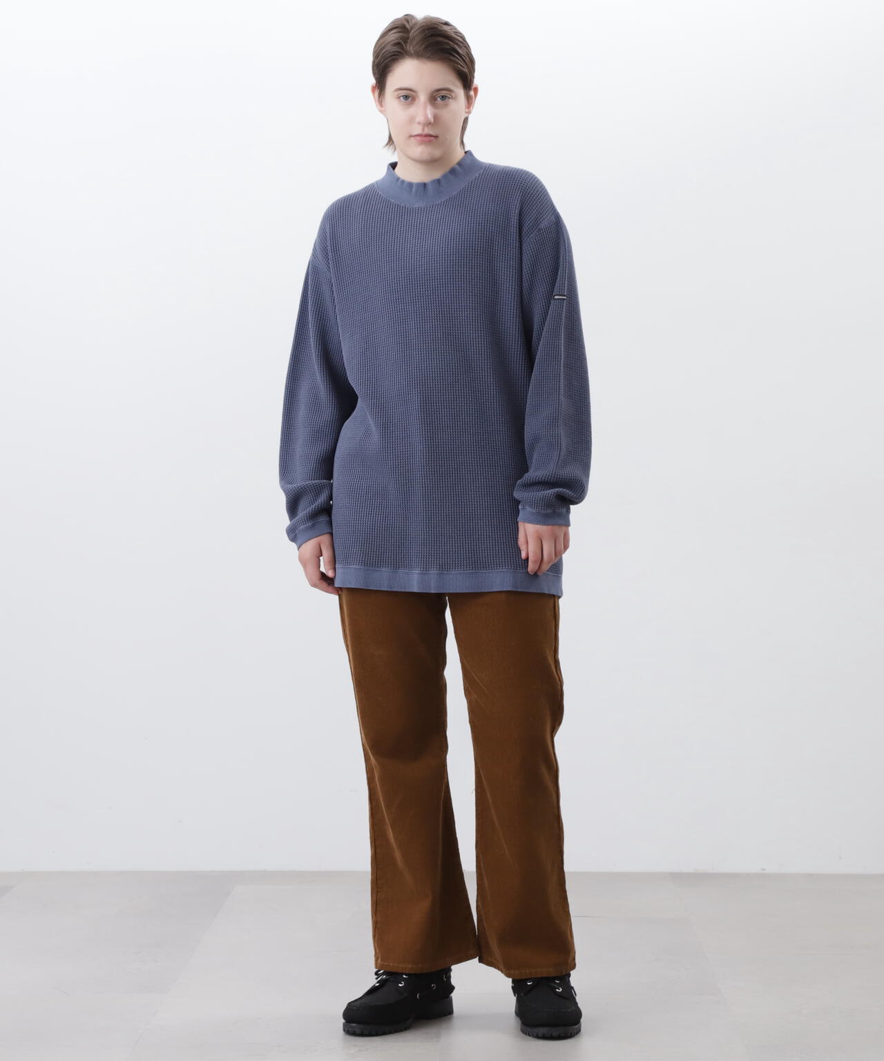 ・モックネックというインナーぽい仕様でありながら、裾がストレートではなく、スウェットのようにリブが付き、シルエットもゆったりしているおかげで、インナーぽさが消え、裾をアウトして着てもヒラヒラせず収まりが良く、L/S TEEよりはしっかりしていて、クルースウェットよりは軽く着れる、ちょうど中間的なのアイテムとして、1枚着からアウターのインナーまでと、汎用性が非常に高い