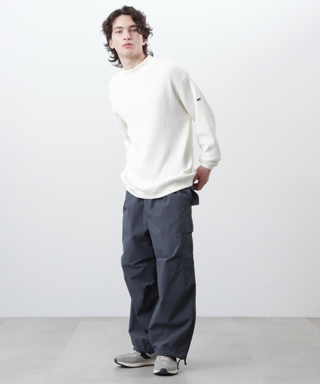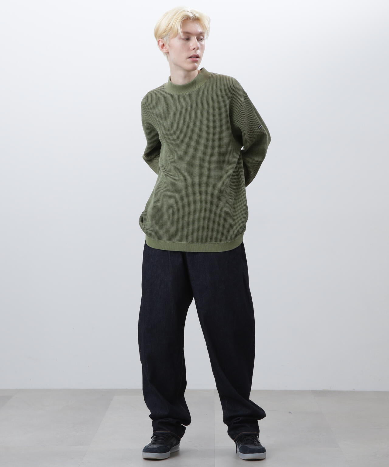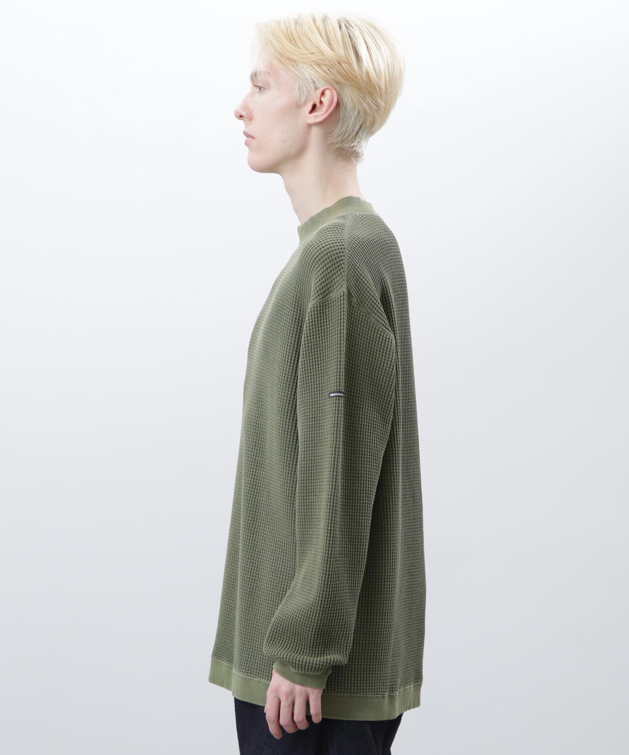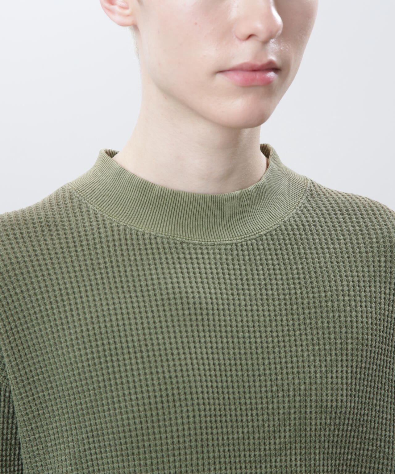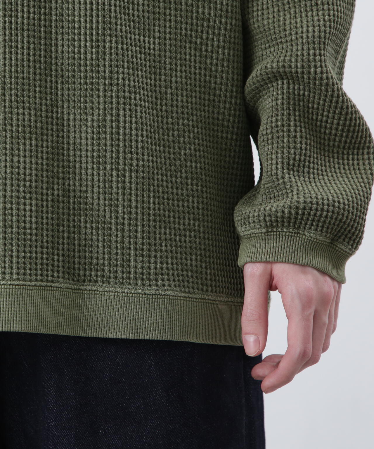 ・モックネックというインナーぽい仕様でありながら、裾がストレートではなく、スウェットのようにリブが付き、シルエットもゆったりしているおかげで、インナーぽさが消え、裾をアウトして着てもヒラヒラせず収まりが良く、L/S TEEよりはしっかりしていて、クルースウェットよりは軽く着れる、ちょうど中間的なのアイテムとして、1枚着からアウターのインナーまでと、汎用性が非常に高い