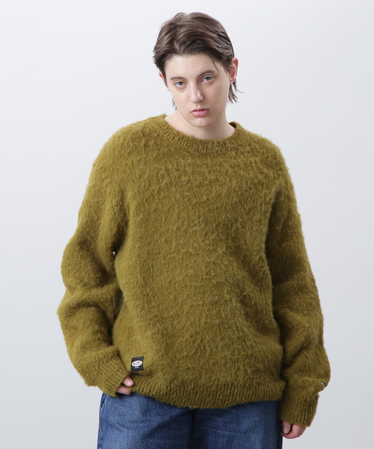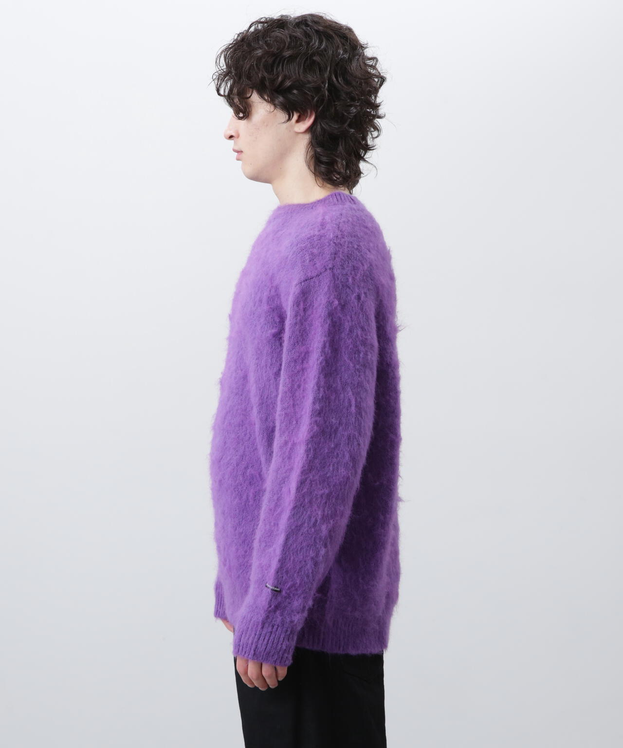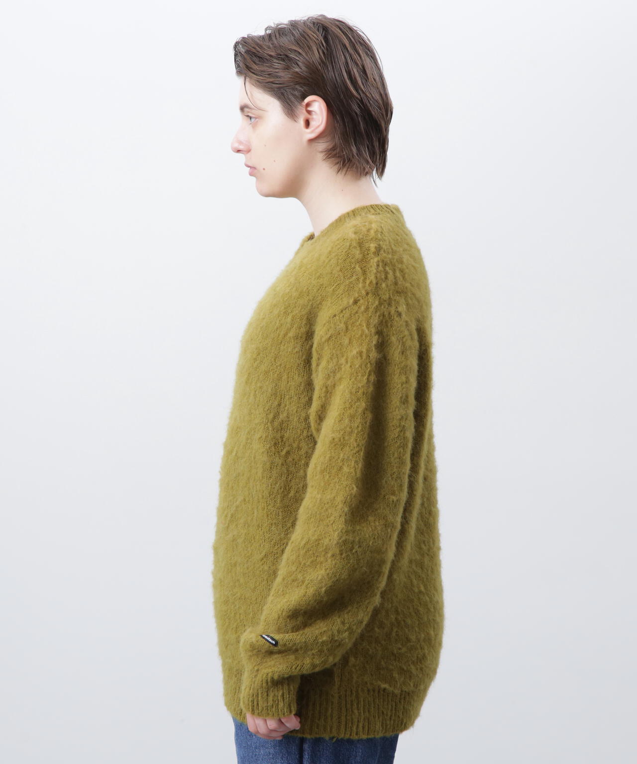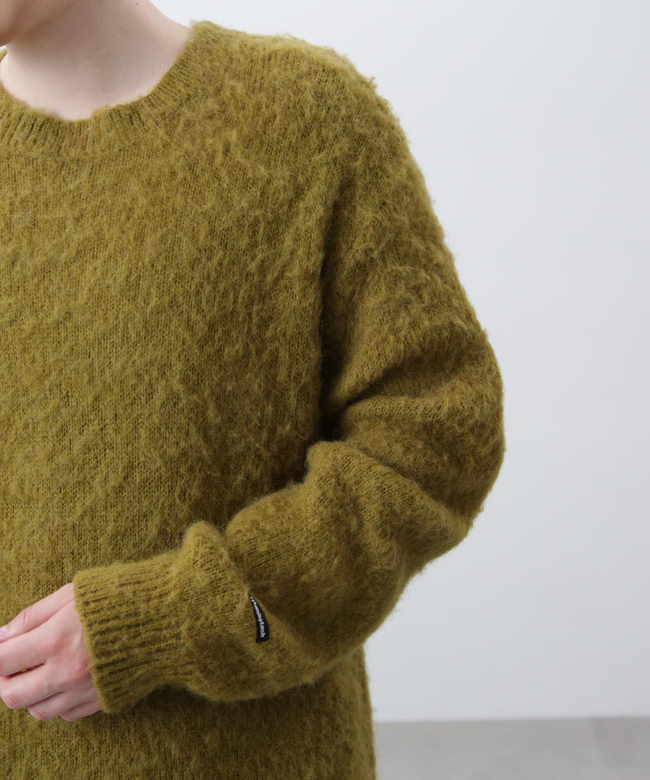 ・アクリル、ナイロン、モヘアの混紡糸を使用し、さらに起毛加工を施すことで、ヴィンテージライクなシャギー感のある風合いに仕上げ、ふっくらと温かみのある、繊細な毛羽立ちが特徴。70% ACRYLIC / 18% NYLON / 12% WOOL。