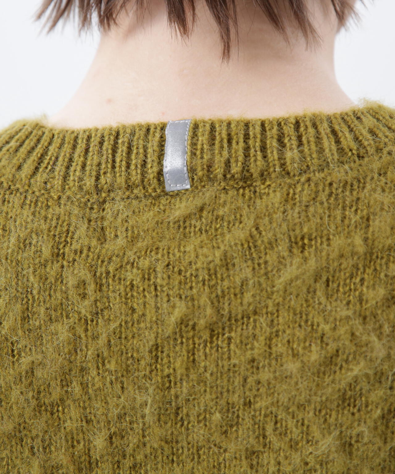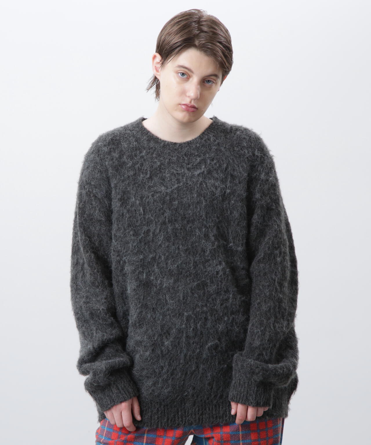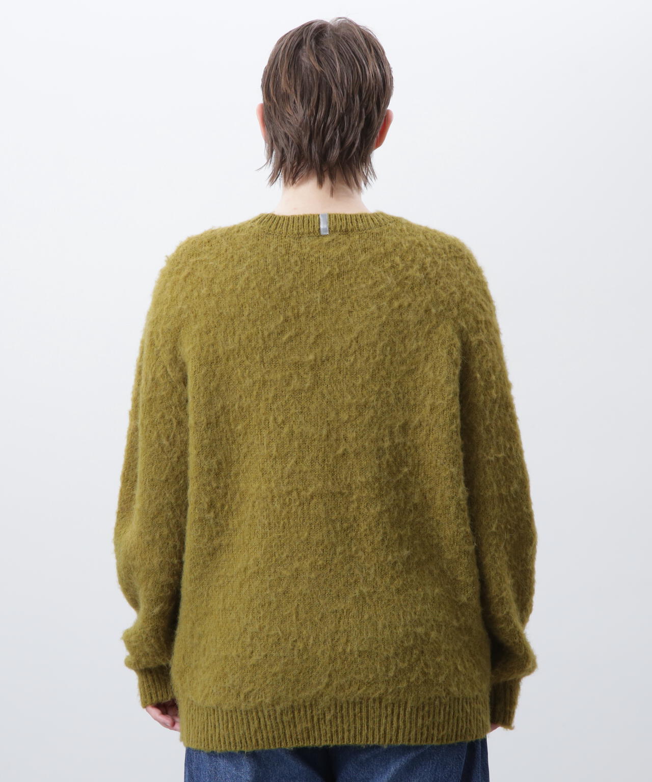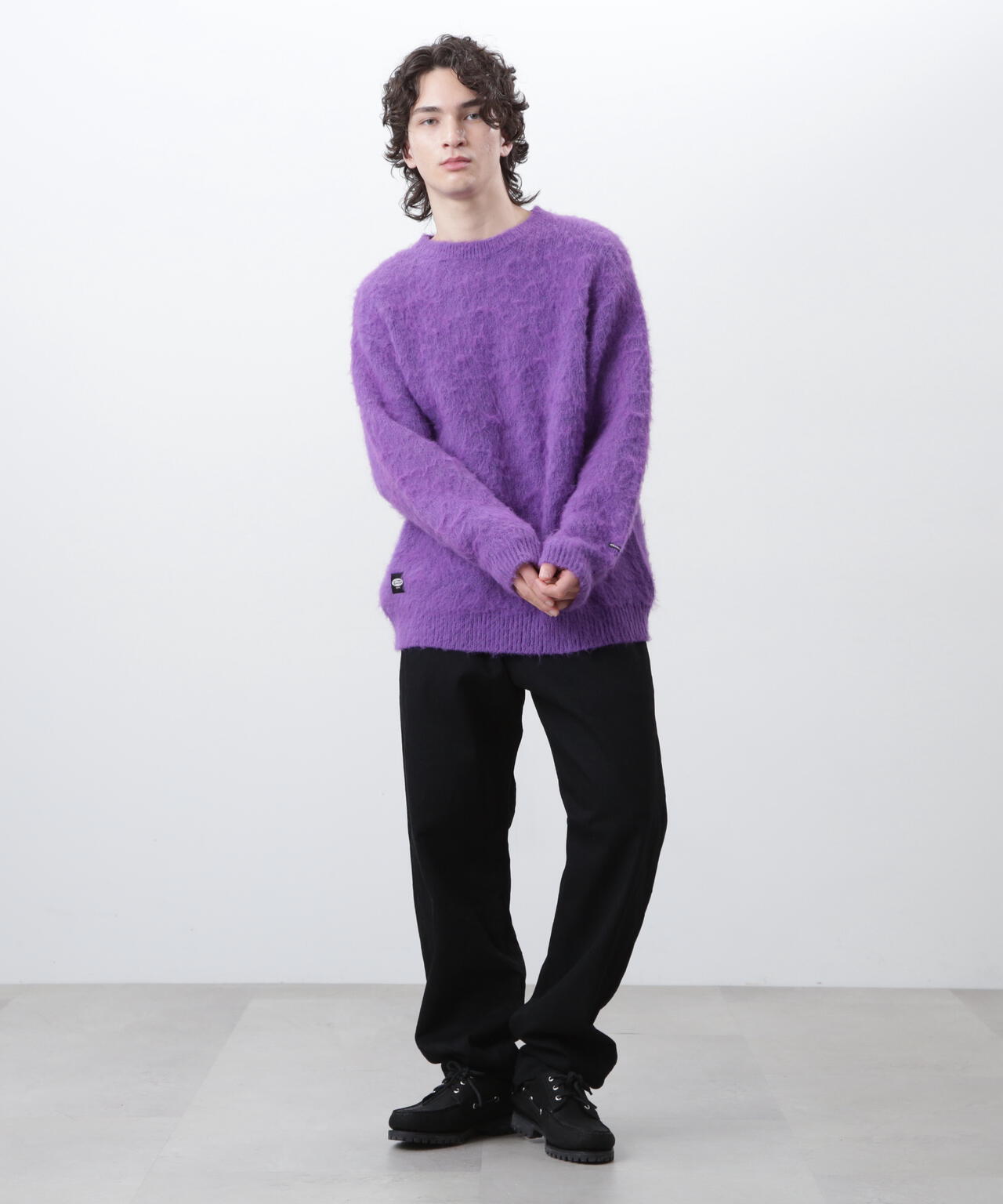 ・アクリル、ナイロン、モヘアの混紡糸を使用し、さらに起毛加工を施すことで、ヴィンテージライクなシャギー感のある風合いに仕上げ、ふっくらと温かみのある、繊細な毛羽立ちが特徴。70% ACRYLIC / 18% NYLON / 12% WOOL。