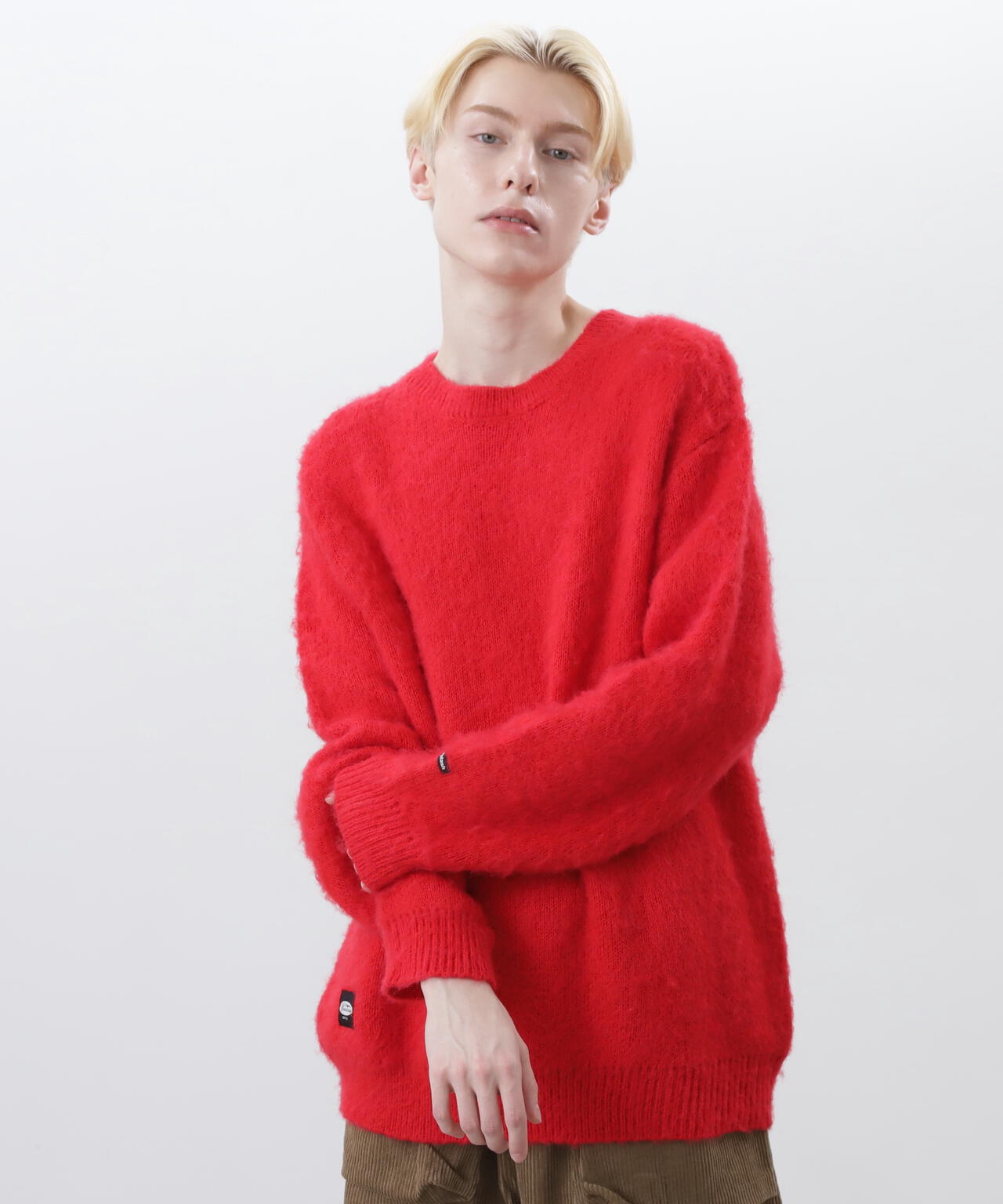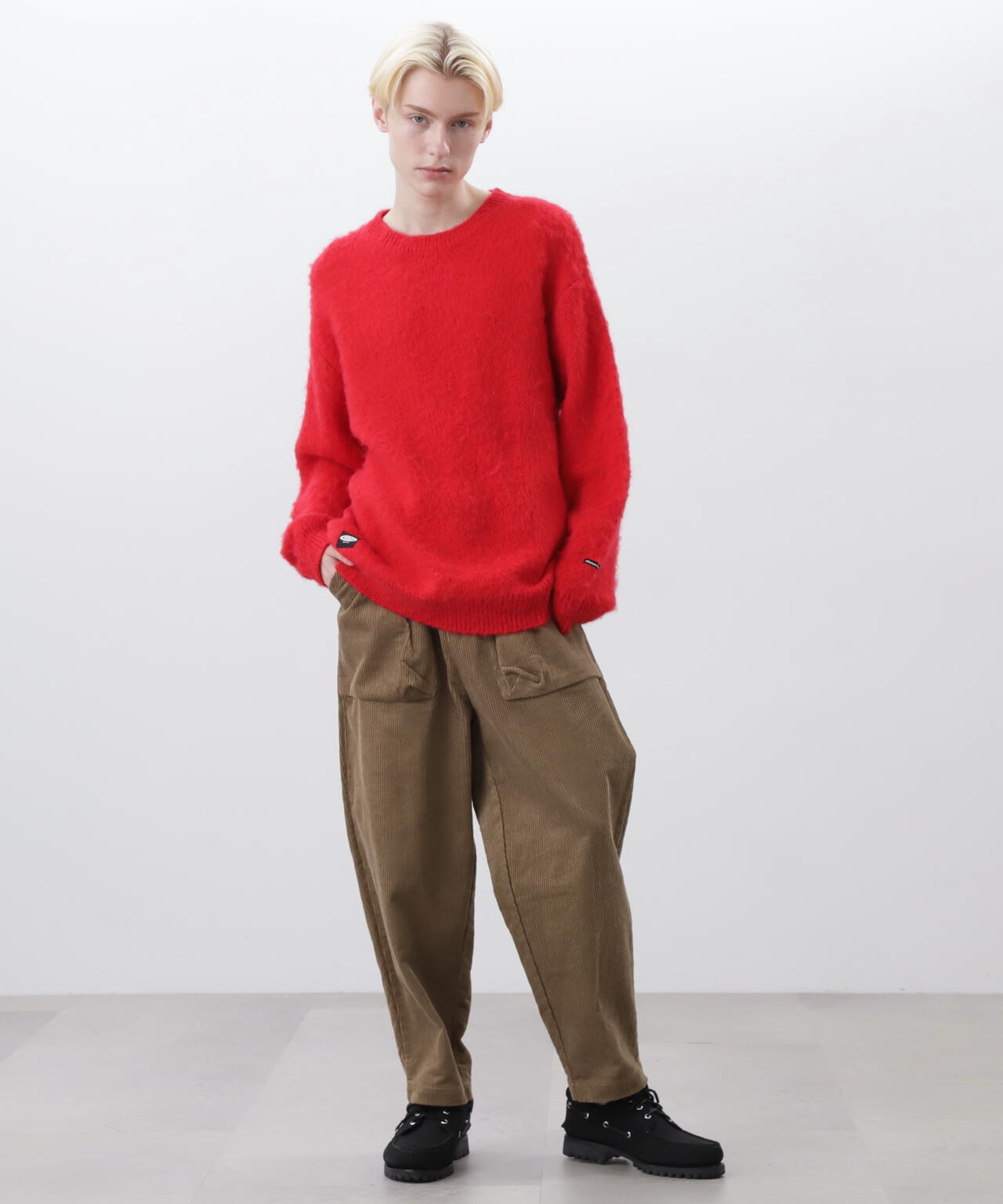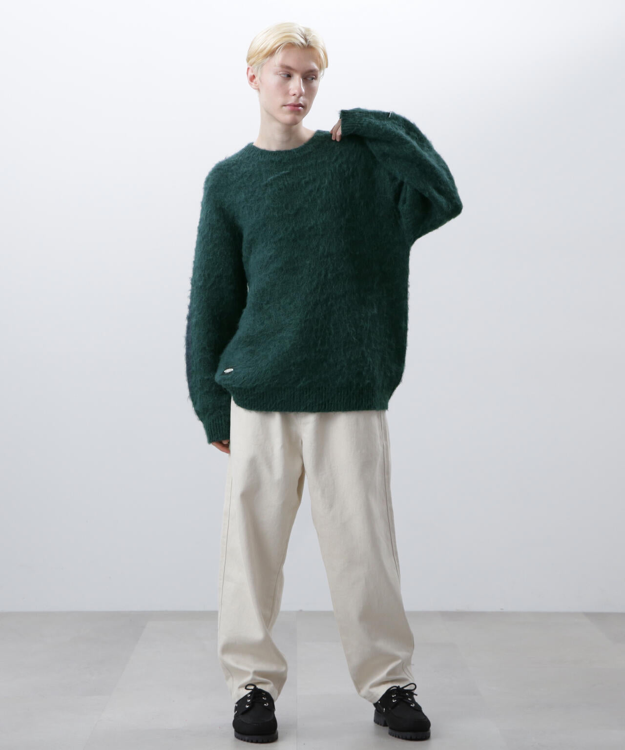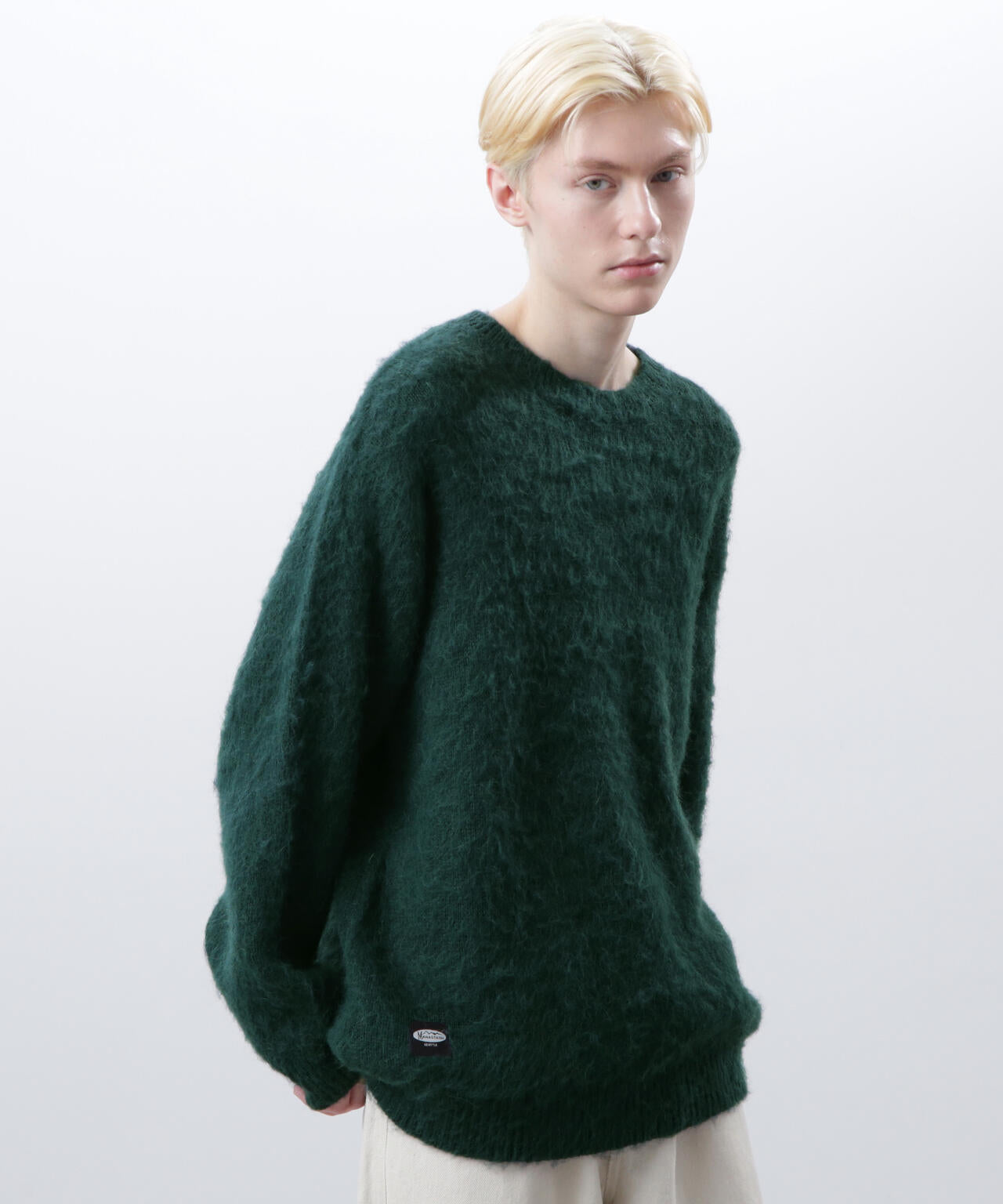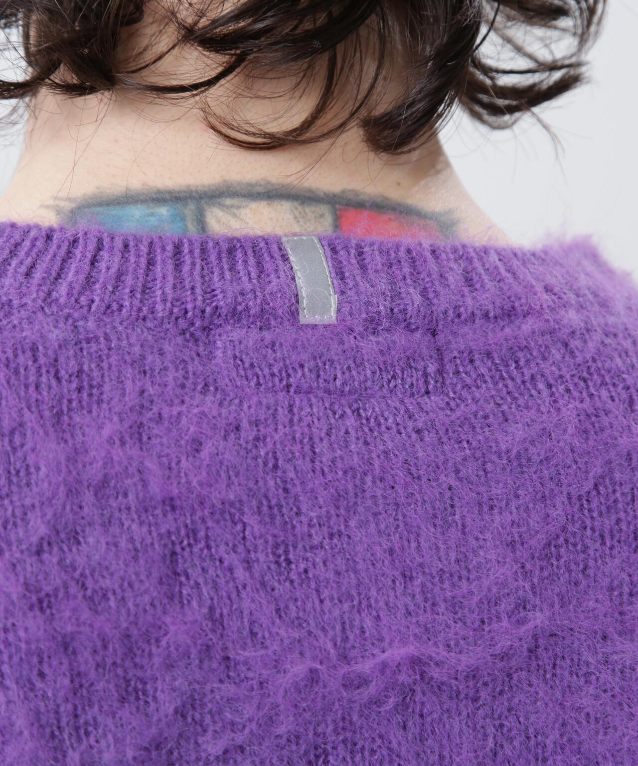 ・アクリル、ナイロン、モヘアの混紡糸を使用し、さらに起毛加工を施すことで、ヴィンテージライクなシャギー感のある風合いに仕上げ、ふっくらと温かみのある、繊細な毛羽立ちが特徴。70% ACRYLIC / 18% NYLON / 12% WOOL。
