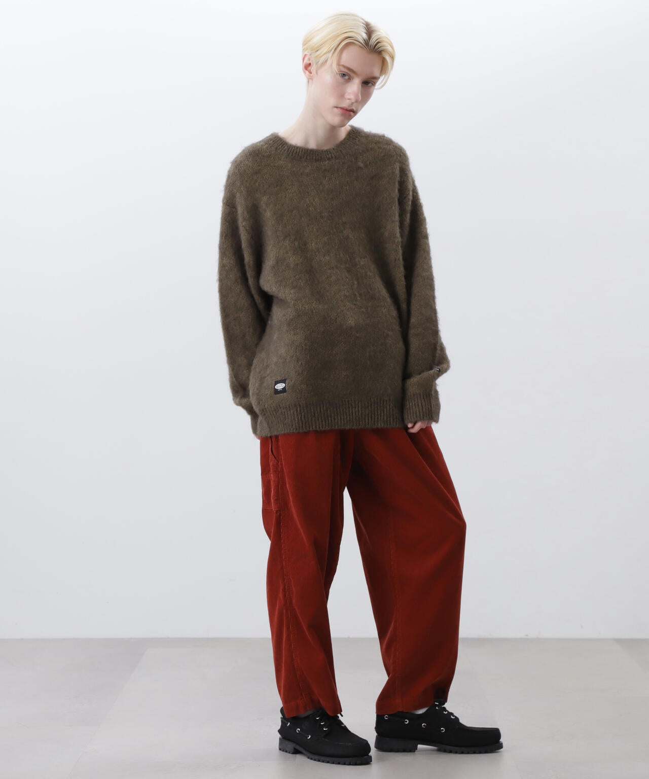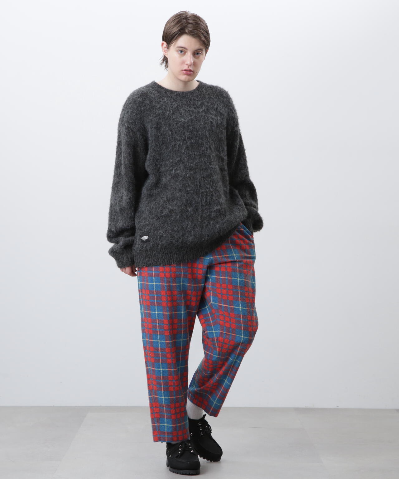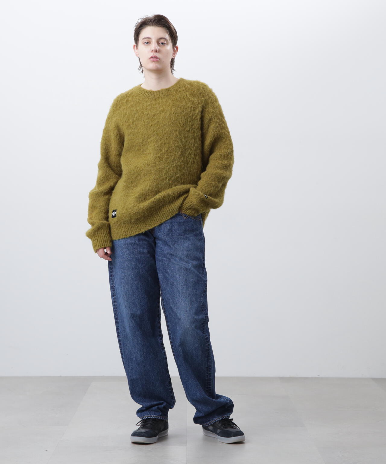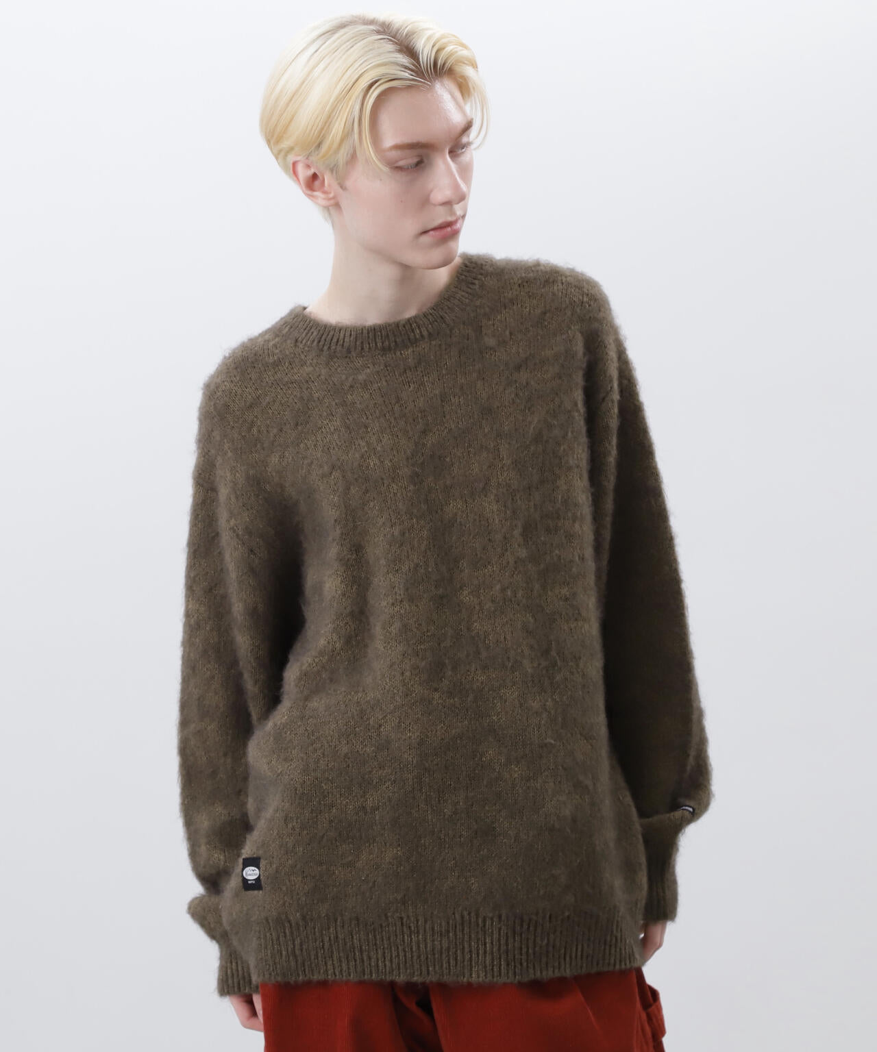 ・アクリル、ナイロン、モヘアの混紡糸を使用し、さらに起毛加工を施すことで、ヴィンテージライクなシャギー感のある風合いに仕上げ、ふっくらと温かみのある、繊細な毛羽立ちが特徴。70% ACRYLIC / 18% NYLON / 12% WOOL。