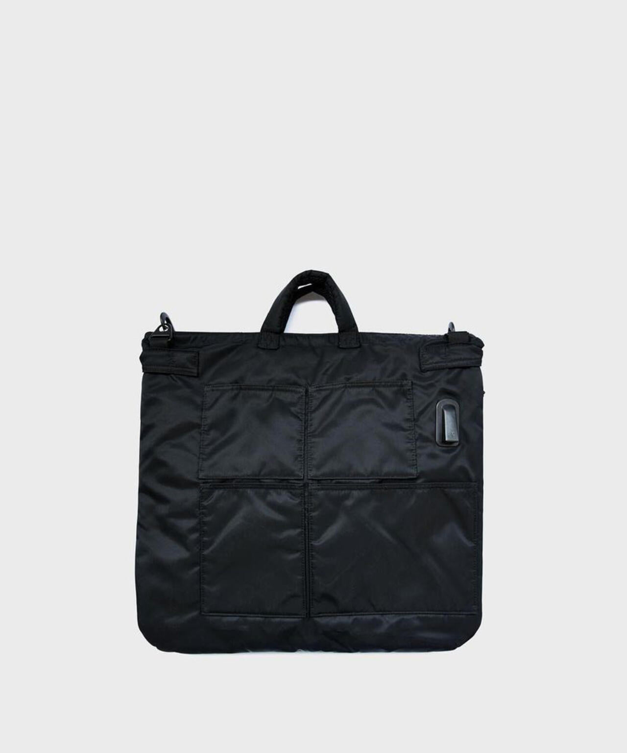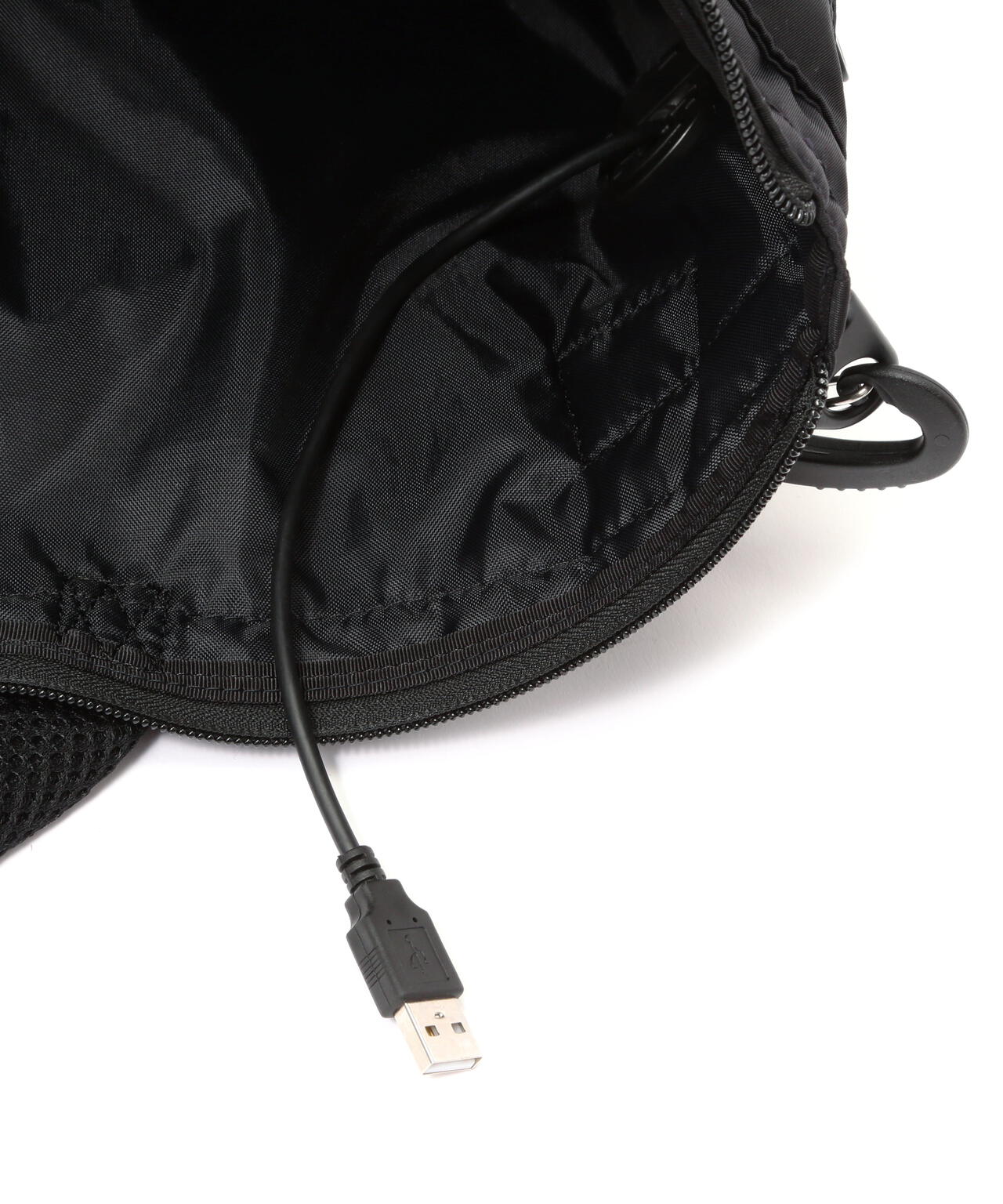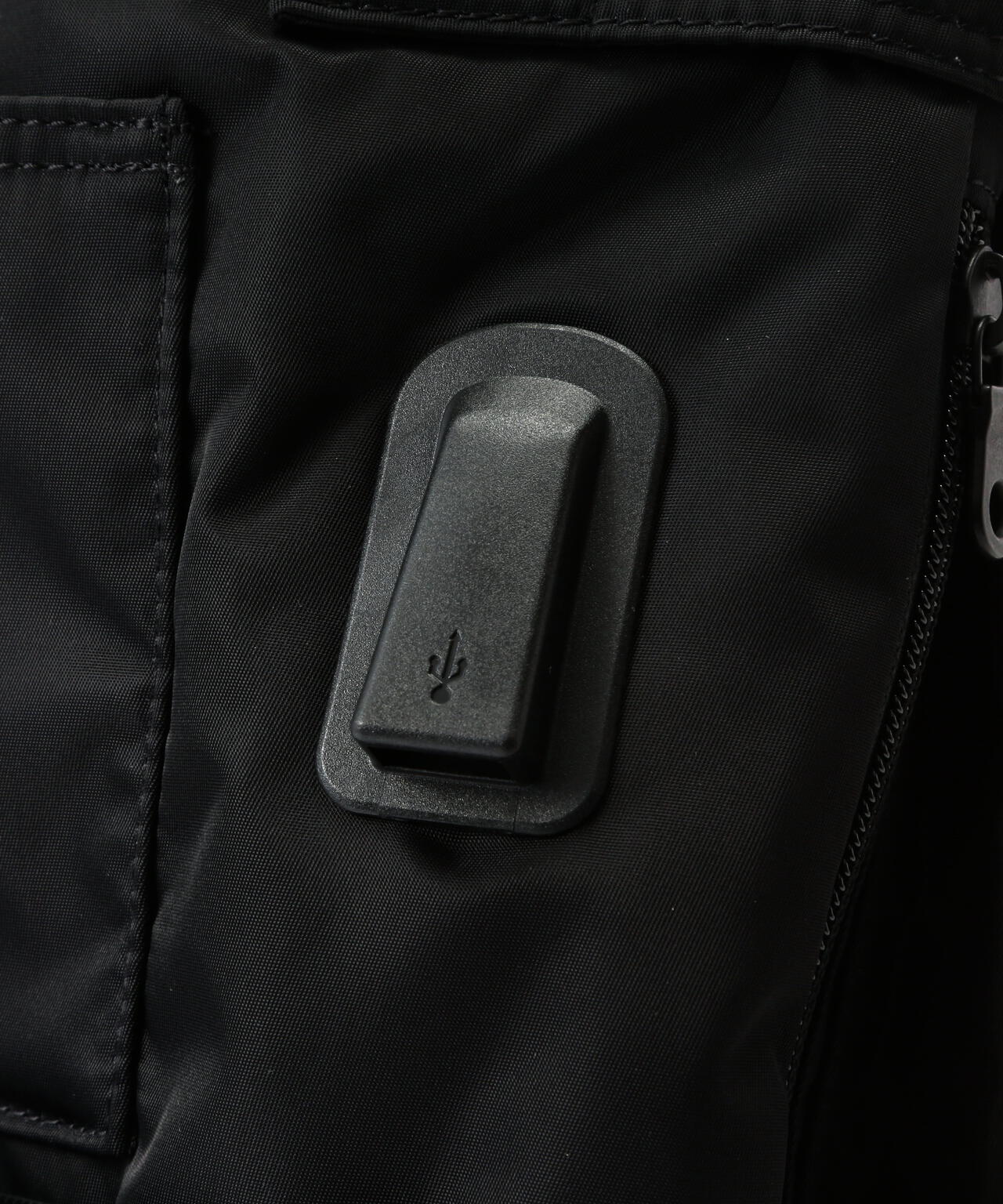 背面にはUSBポートを装備。バッグ内部のケーブルにモバイルバッテリーを繋げれば、背面で手軽にスマホなどが充電できる。