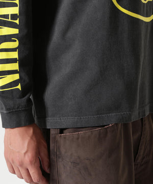 フロントにスマイルマークとバンドロゴを組み合わせたアート、袖に「NIRVANA」のモチーフをプリントしたアイテム。