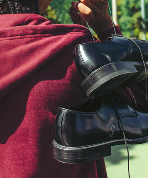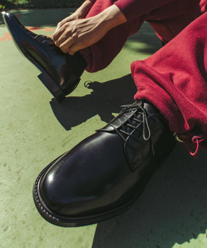 ブランドが誕生した1986年の1stコレクションにラインアップされていたアーカイブを活用し、ローファー同様に既存の日本製革靴にはない要素を加え発信をするヒモ靴の第一弾。踵下と土踏まずをサポートするクッションインソールを採用し、履き始めからストレスを感じにくい、日常使いに最適なスペックを備えています。
