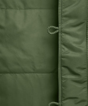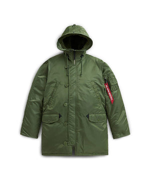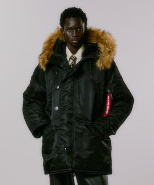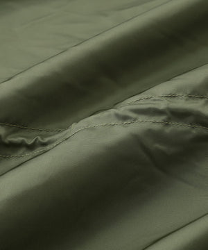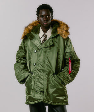 N-3Bパーカのナイロンシェルとポリエステルの裏地が冷気の侵入を防ぎます。