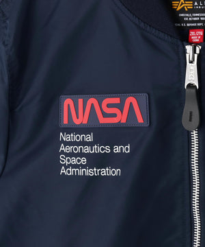 右袖にはNASAワームロゴのラバーパッチとNASAパッチ、左袖にはアメリカ国旗パッチを配置。