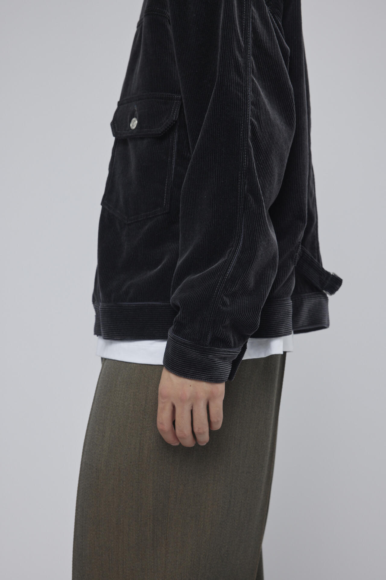 型が持つ余白感と素材の柔らかさと光沢感が相まって、ワークウェアのタフさがありながらも上品さも兼ね備えた仕上がり。今シーズンは背ヨーク裏と前身頃裏にオフホワイトのスレキを使いワークウェア感が演出されています。