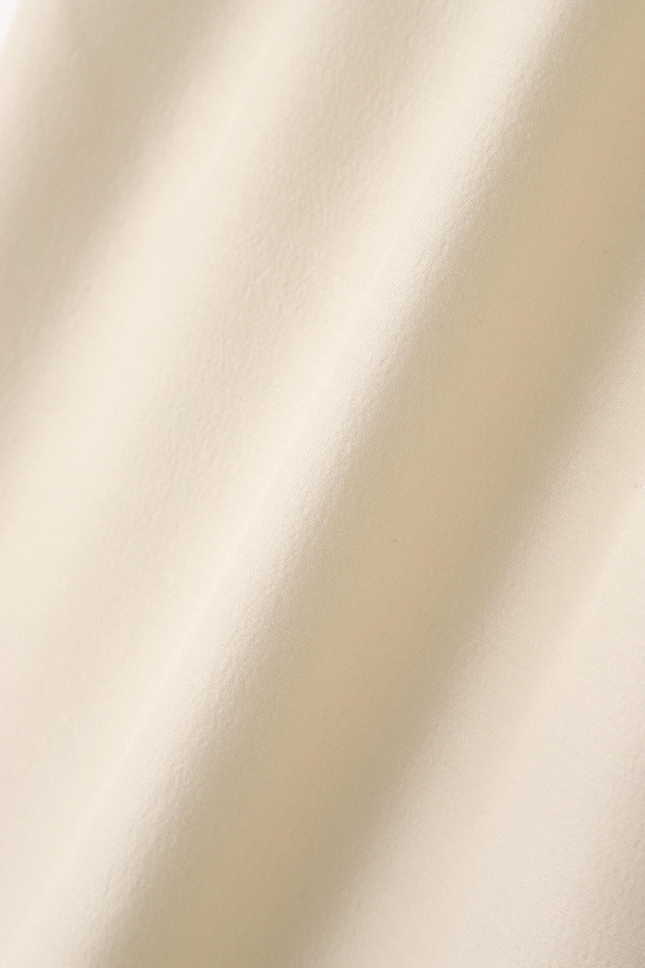 生地の表面にウール素材がメインとして現れることで、シルク特有の光沢が適度に抑えられるため、上品な印象で着用出来る仕上がりとなっています。生地の打ち込みを強めた分、ハリコシがありながらも、糸質の良さで奥にある柔らかさを感じることが出来るのも、この素材ならではです。たっぷりと設けた腰周りのタックによって、十分な余白がありながらも、裾へ向かうシルエットが美しい為、素材のハリコシとの相性も良く、ラフなデザインながらも、品良くまとまっています。適度に光沢のある表情ながら、同素材で作製したトップスとのセットアップで着用しても、厭らしさを感じない仕上がりなのも、この素材の秀逸さを物語ってくれています。素材感を活かしたドレッシーなスタイルも、シルエットを活かしたカジュアルなスタイルも、どちらも共にシックな印象に仕上げてくれるタック入りのイージートラウザーです。