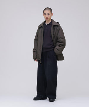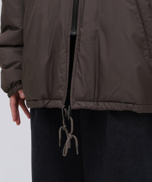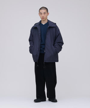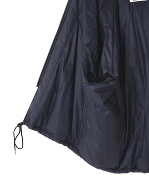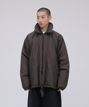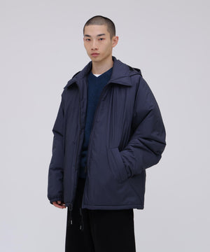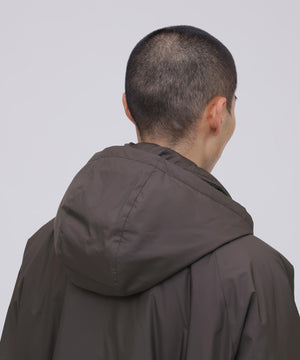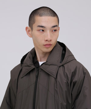 表生地には、 撥水性のある軽やかな素材を採用し、 プリマロフトの持つ軽さと滑らかさを際立たせています。 軍事採用される程 「保温性」、 「軽量性」、 「撥水性」、 「柔軟性」、「通気性」、 「収納性」 それぞれに優れたプリマロフトは、 現代の防寒具として最適な素材です。高機能素材ながら、 王道のコーチジャケット型をベースに、特徴的な腕付けや、襟とフードが一体となった変則的なデザインに仕上げることで、 親しみやすさと、少しの違和感を生んでいます。 ブランドが毎シーズン提案する高機能アウターのプリマロフトシリーズより、新作として完成させた変則ディテールのコーチジャケットです。